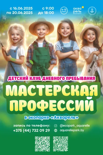 Экопарк «Акварель» детей 6–12 лет в увлекательное приключение, где каждый день — новая профессия! Ребята попробуют себя в роли шеф-повара, зоолога, агронома, рыболова или дублера, познакомятся с профессионалами, найдут друзей и раскроют свои таланты.