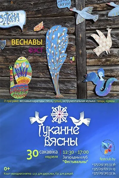 Клуб «Фестывальны» запрашае разам наблізіць вясеннюю цеплыню — прыміце удзел у адмысловым свяце «Гуканне вясны» разам з фальклорнымі гуртамі «Горынь», «Стажары», «Анягож» і іншымі, музычнымі капэлямі.