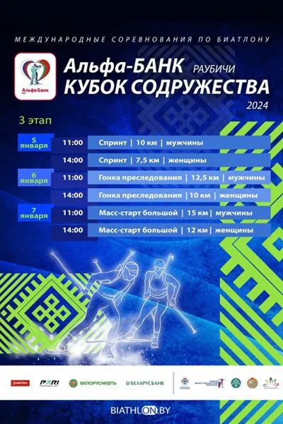 На III этапе международных соревнований по биатлону «АЛЬФА-БАНК КУБОК СОДРУЖЕСТВА» выступят более 60 ведущих биатлонистов из России и Беларуси. Спортсмены будут сражаться за звание лучших в различных дисциплинах биатлона, включая спринт, гонку преследования и масс-старт. Обещают, что мероприятие станет настоящим спортивным праздником и принесет множество незабываемых эмоций не только участникам, но и зрителям, для которых в Раубичах будет работать зона гостеприимства с фудкортом, сувенирами и розыгрышем подарков от Белорусской федерации биатлона.