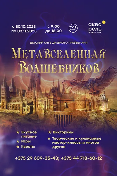 Подробная информация и запись в детский клуб дневного пребывания осуществляются по телефонам: +375 29 609-35-43 (Юлия), +375 44 718-60-12 (ресепшен экопарка «Акварель»).Программа клуба дневного пребывания «Метавселенная волшебников»