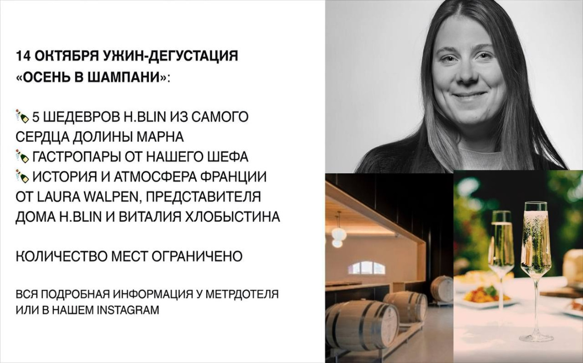 14 октября ресторан Brioche Bistro станет ближайшей точкой к Шампани: здесь пройдет эногастрономический вечер при участии Лауры Валпен (Laura Walpen), руководителя экспорта шампанского дома H.Blin.