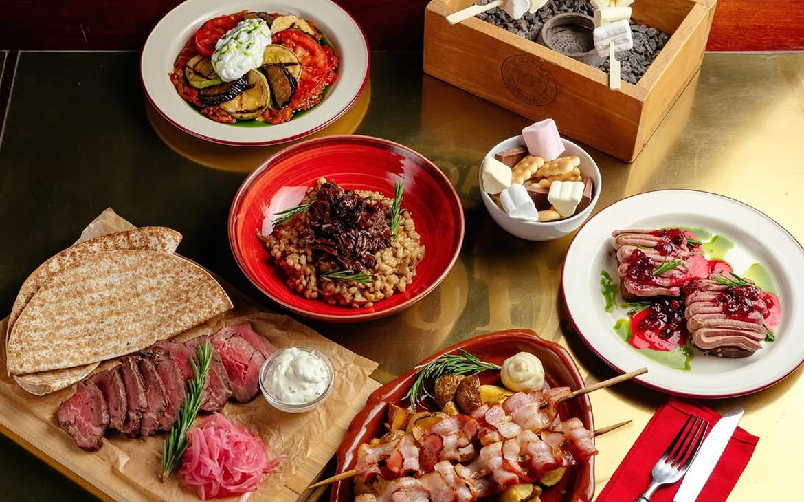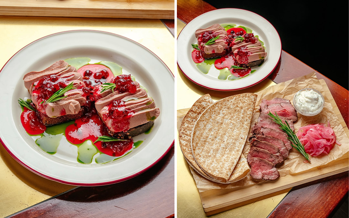 - Ростбиф на огне с малиновым луком, домашним чесночным соусом и лепёшкой.