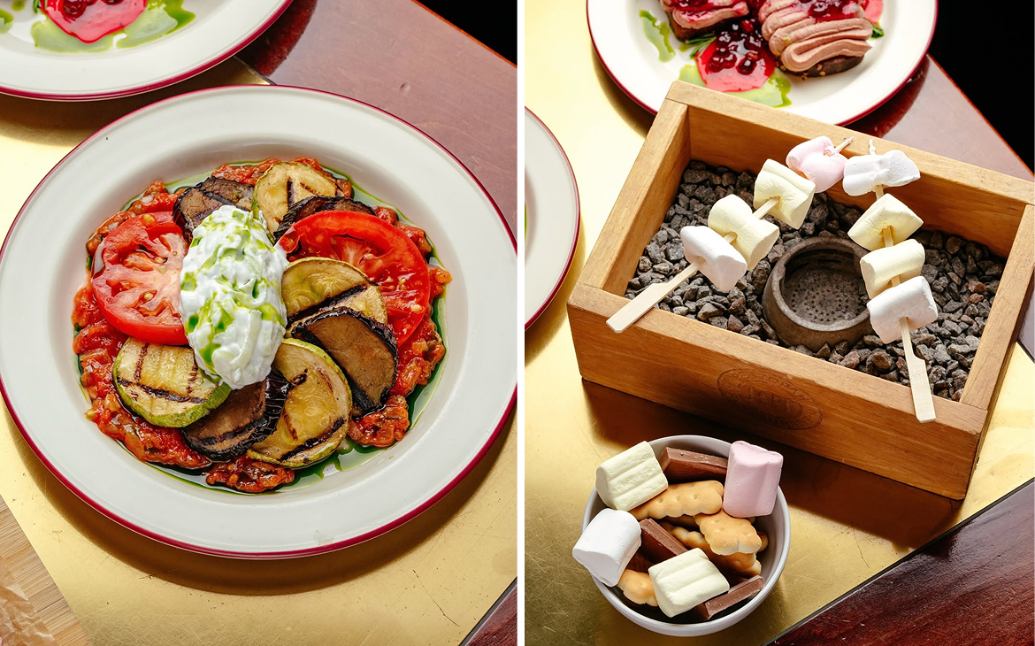 - Овощи, запечённые на гриле, с соусом пилати и дзадзики.