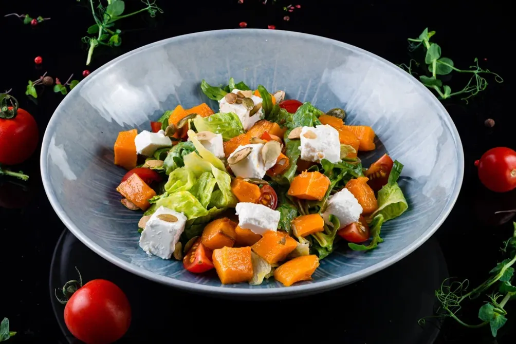 Среди салатов – 8 видов на любой вкус. От классического «Греческого» до интересных исключительно осенних вариантов с печеной тыквой и сыром или салата с хрустящими баклажанами.
