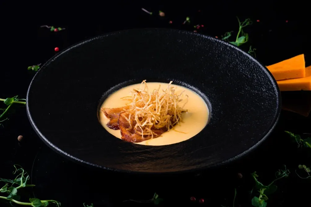 В осеннем меню супов есть всеми любимые борщ и солянка, а еще сезонный яркий крем-суп из тыквы и нежный сытный сырный суп с чипсами из бекона.