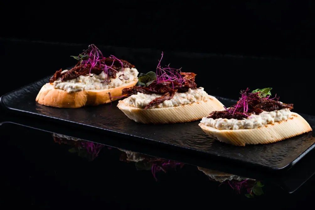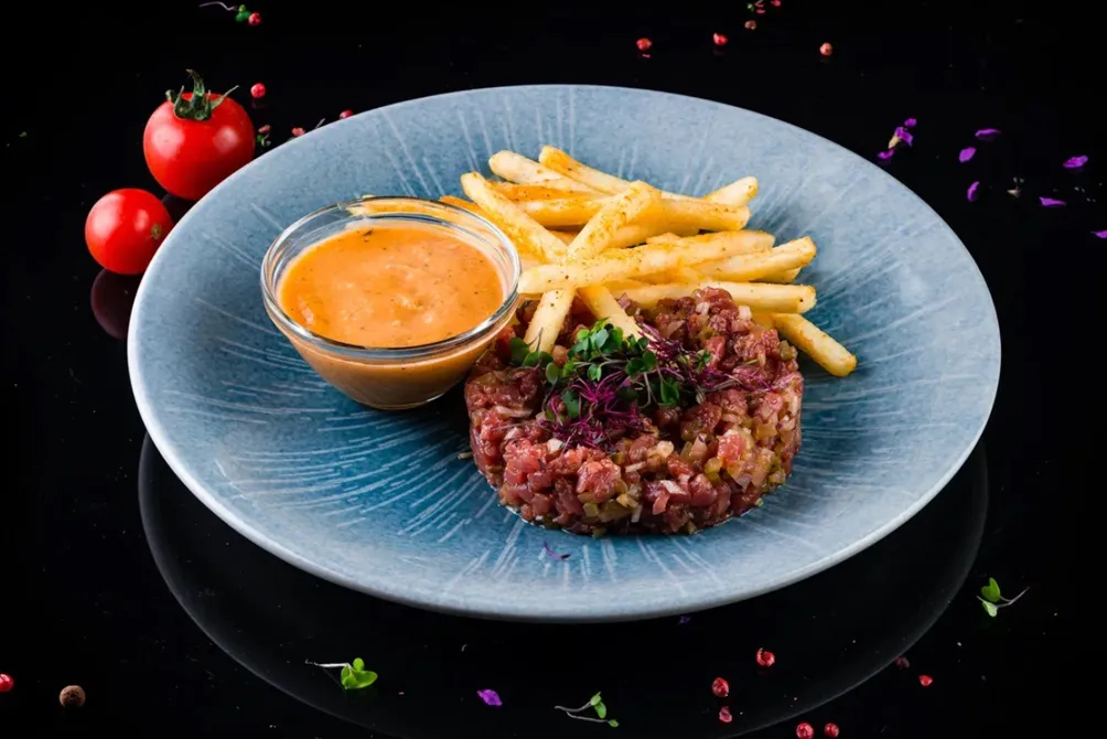 Холодные закуски: несколько видов брускетт с различными начинками из мяса, овощей, морепродуктов, карпаччо из говядины или креветок, а также классический тартар, который здесь подают с картофелем фри