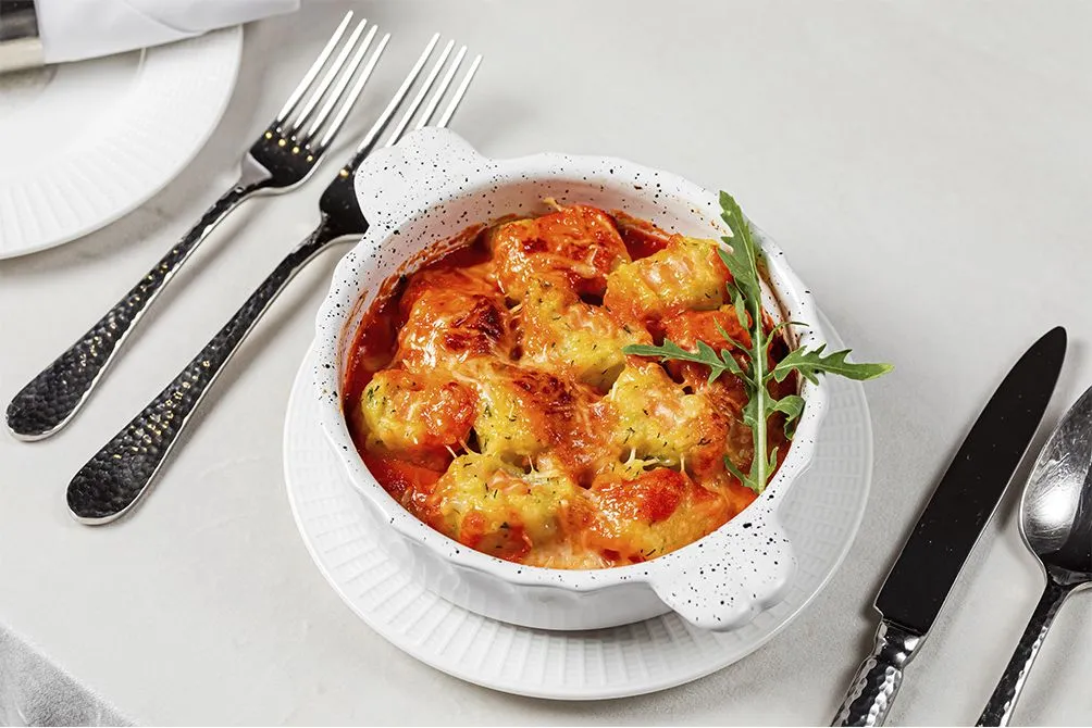 - Картофельные ньокки, фаршированные лососем, запеченные в соусе Наполи