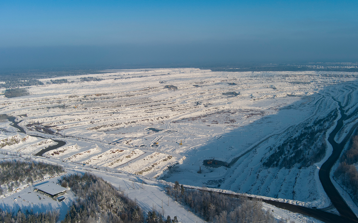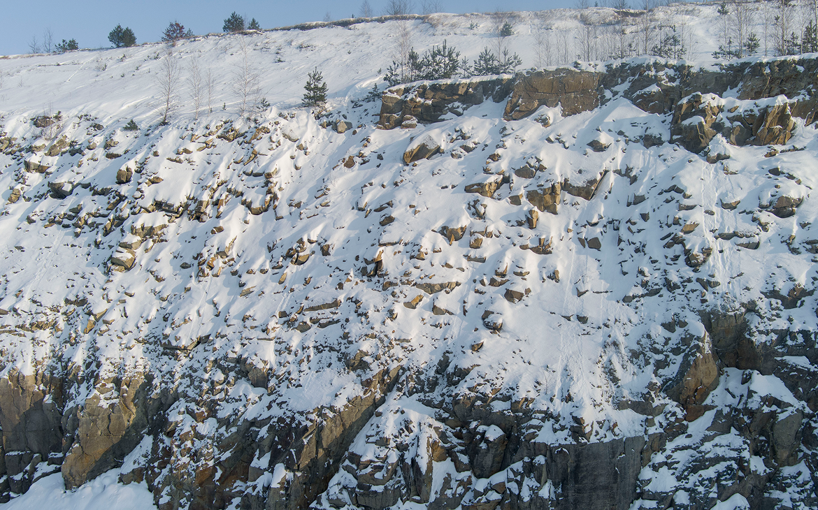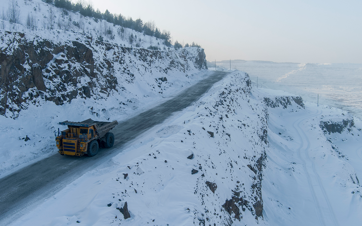 Не менее впечатляюще выглядит и сам карьер под снегом. Белоснежные террасы контрастируют с темными линиями дорог и мощной геометрией скал. Даже зимой здесь продолжается работа техники, и индустриальный ритм неожиданно гармонирует с тишиной и масштабом природы.