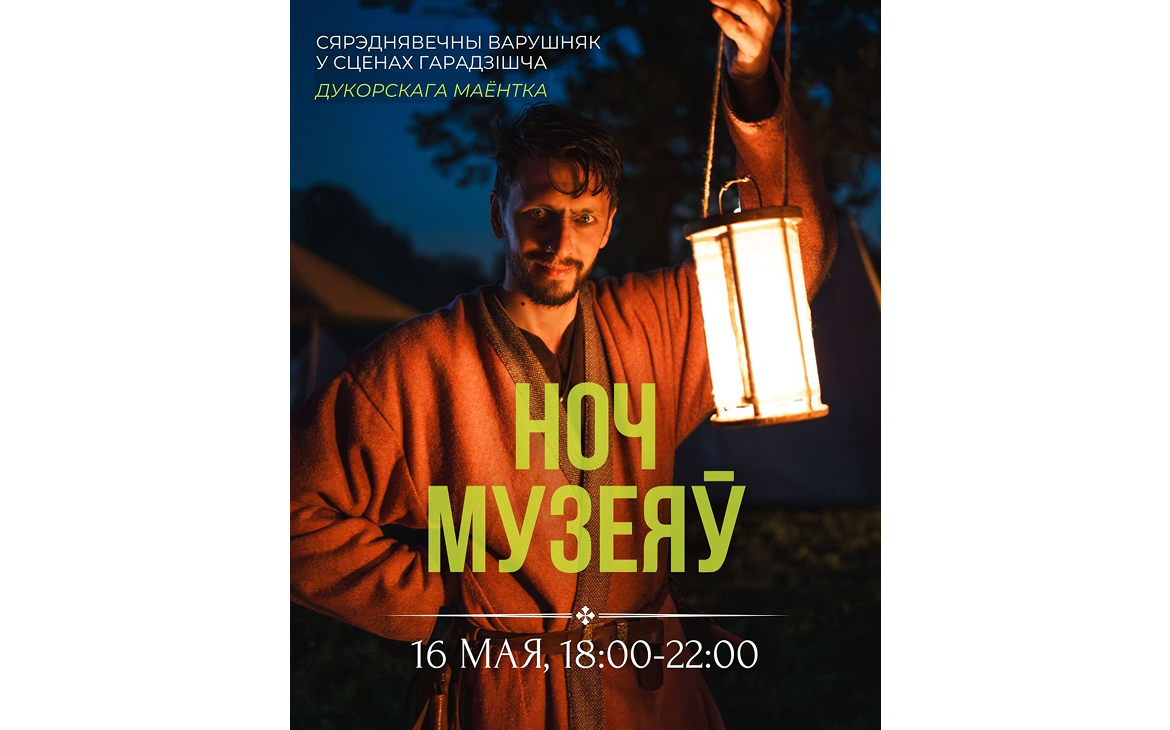 16 мая – Ноч музеяў (18:00-22:00). Вандроўка па вечаровым драўляным гарадзішчы на беразе ракі: карыстаем старадаўнюю зброю і сігнальныя музычныя інструменты, слухаем жудасныя казкі і жывую музыку часоў сярэдніх вякоў, танцуем каля агню і частуемся стравамі па рэцэптах продкаў.