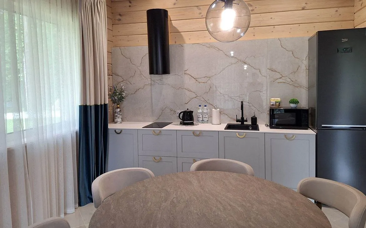 В коттедже есть просторная терраса с удобной мебелью и шезлонгами, где вы можете отдохнуть и выпить свой утренний кофе, заниматься йогой или устроить романтическое свидание.
