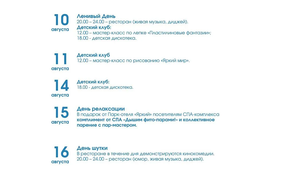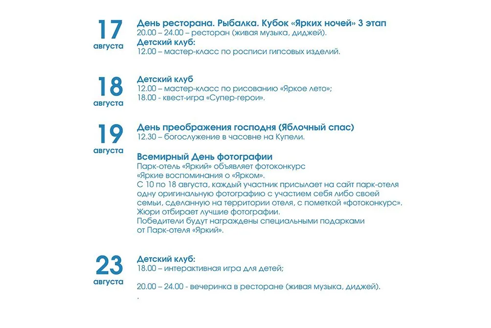 Для гостей на регулярной основе проходят различные мероприятия и действуют специальные предложения. Посмотрим, что интересного будет в августе: комплименты от СПА, рыбалка, Кубок «Ярких ночей», фотоконкурс, барбекю-день, вечера живой музыки и кино. Выбирайте актуальные для вас и бронируете даты по номеру +375 (29) 309-00-44