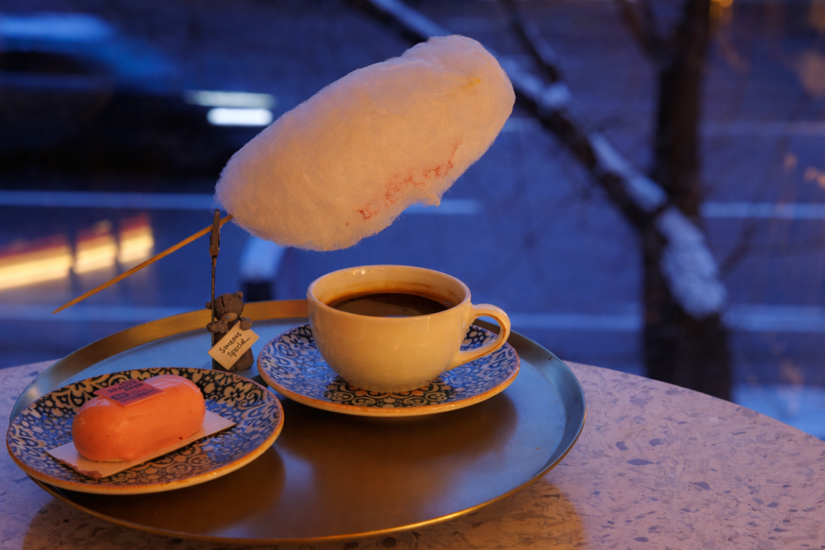 Главная звезда меню — клауд-кофе. Над чашкой с эспрессо закрепляют облако сахарной ваты, которое постепенно тает от пара, превращаясь в сладкий сироп. Цена — 6 рублей. Выглядит эффектно, особенно в сторис.