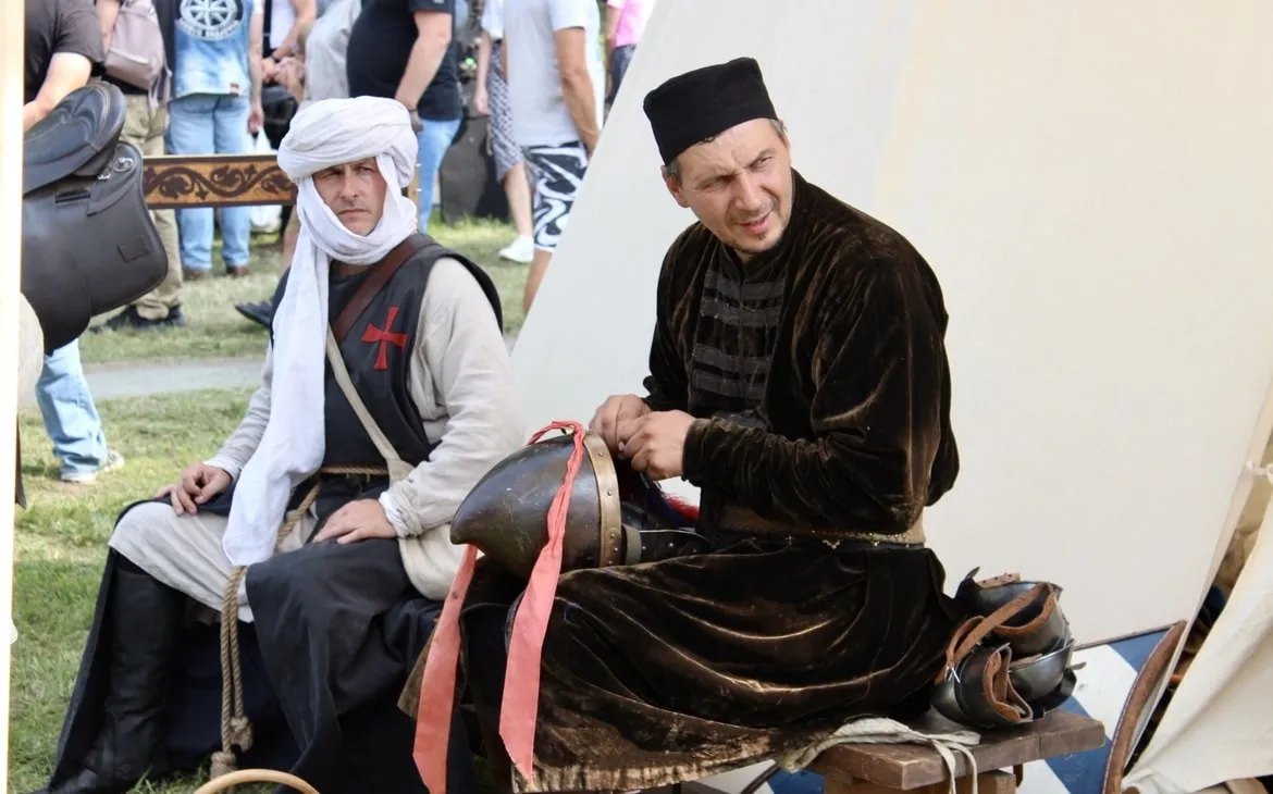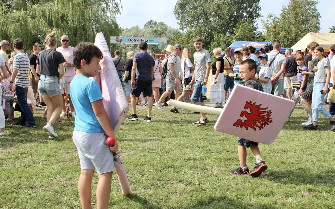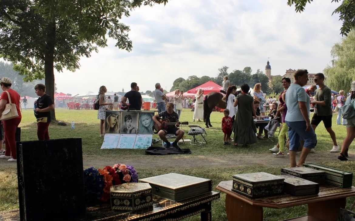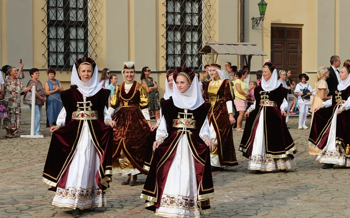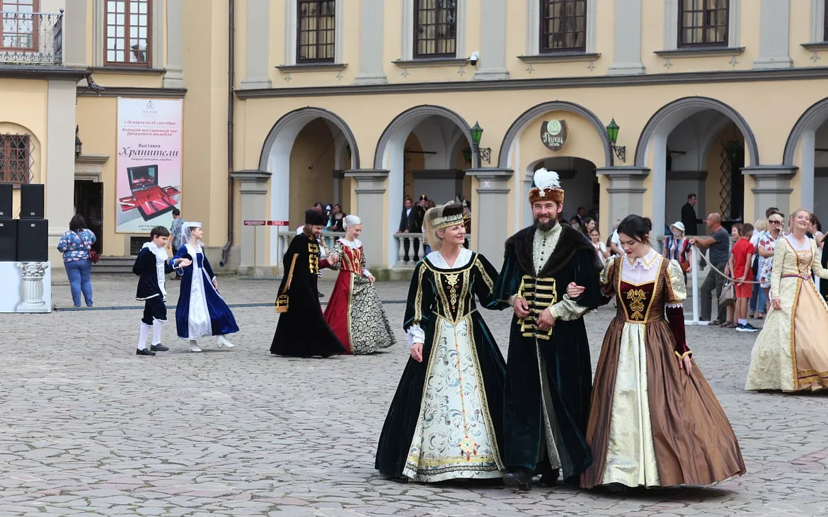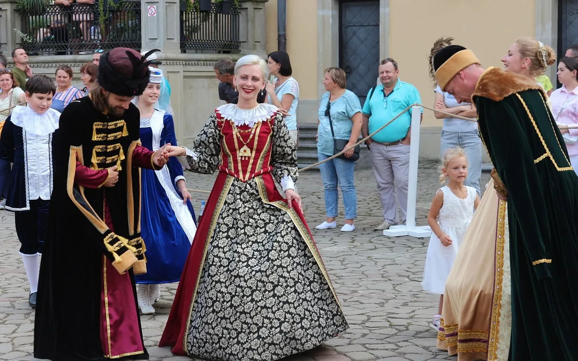 Между торговыми рядами можно было встретить изящных дам в пышных платьях вековой давности. Шикарный образ дополняли веер и широкополая шляпа. Рядом шли князья в длинных кафтанах, с широким подпоясанным жупаном и в шапке с меховой опушкой (и всё это в +24!).