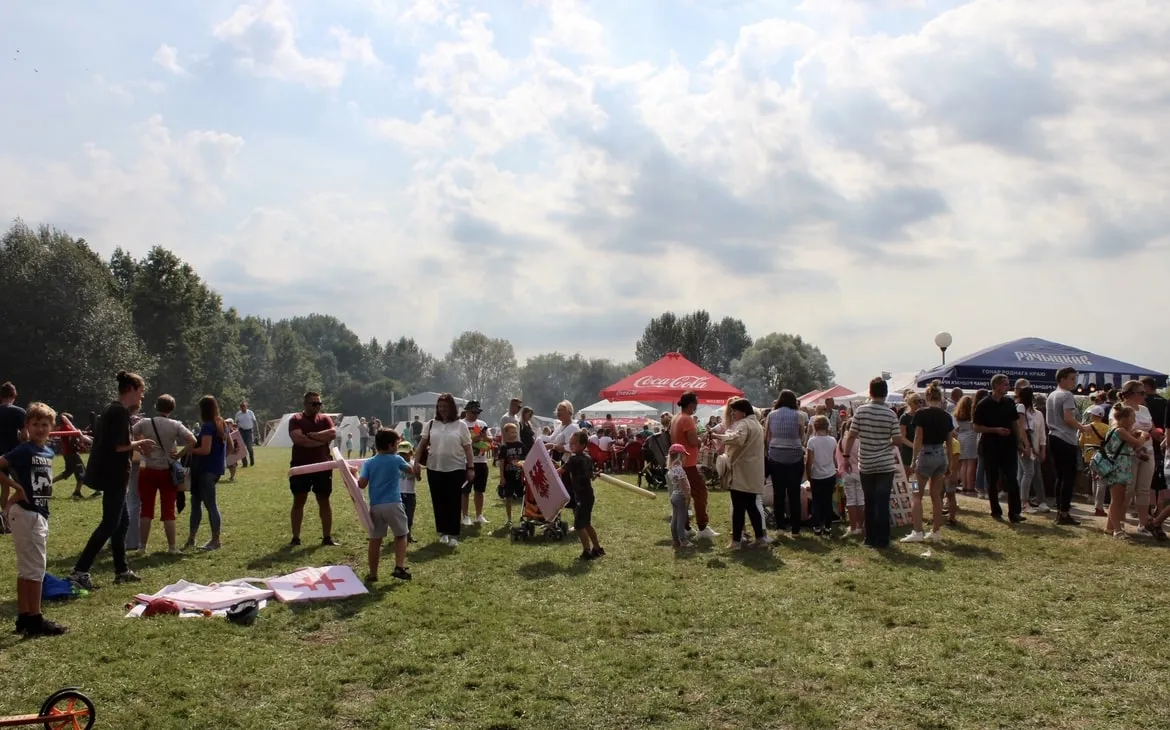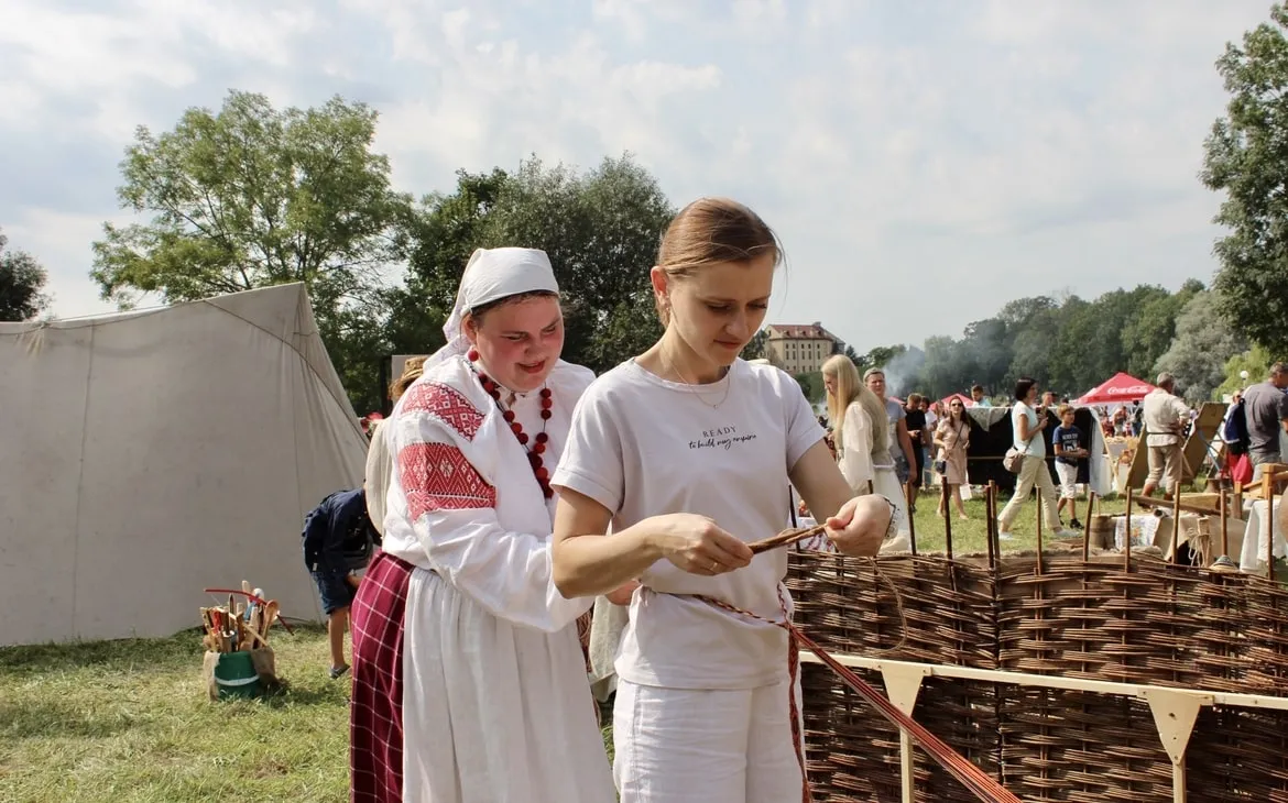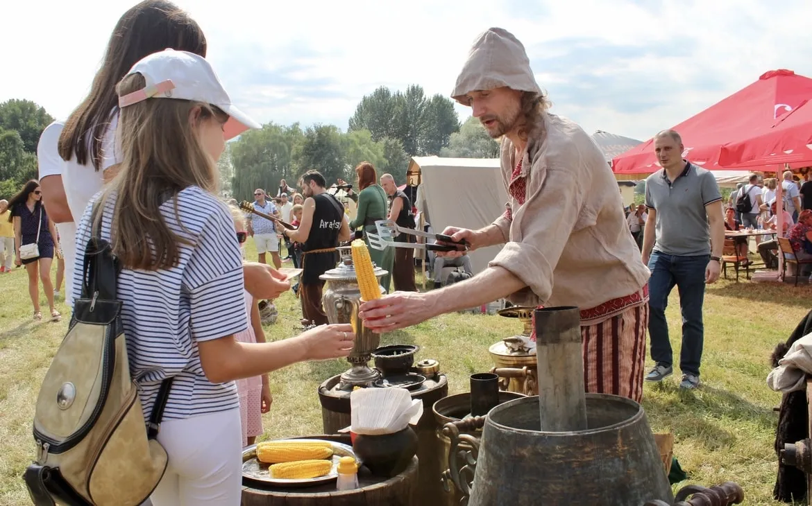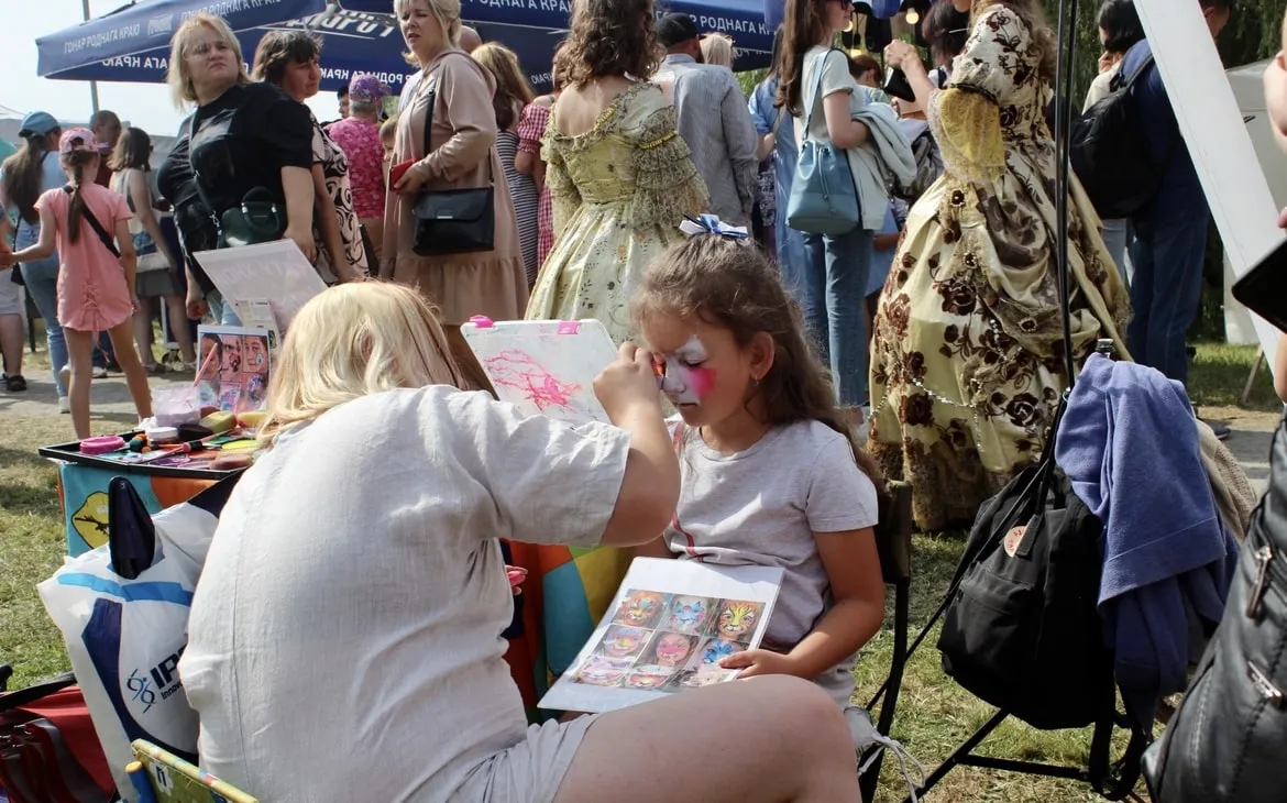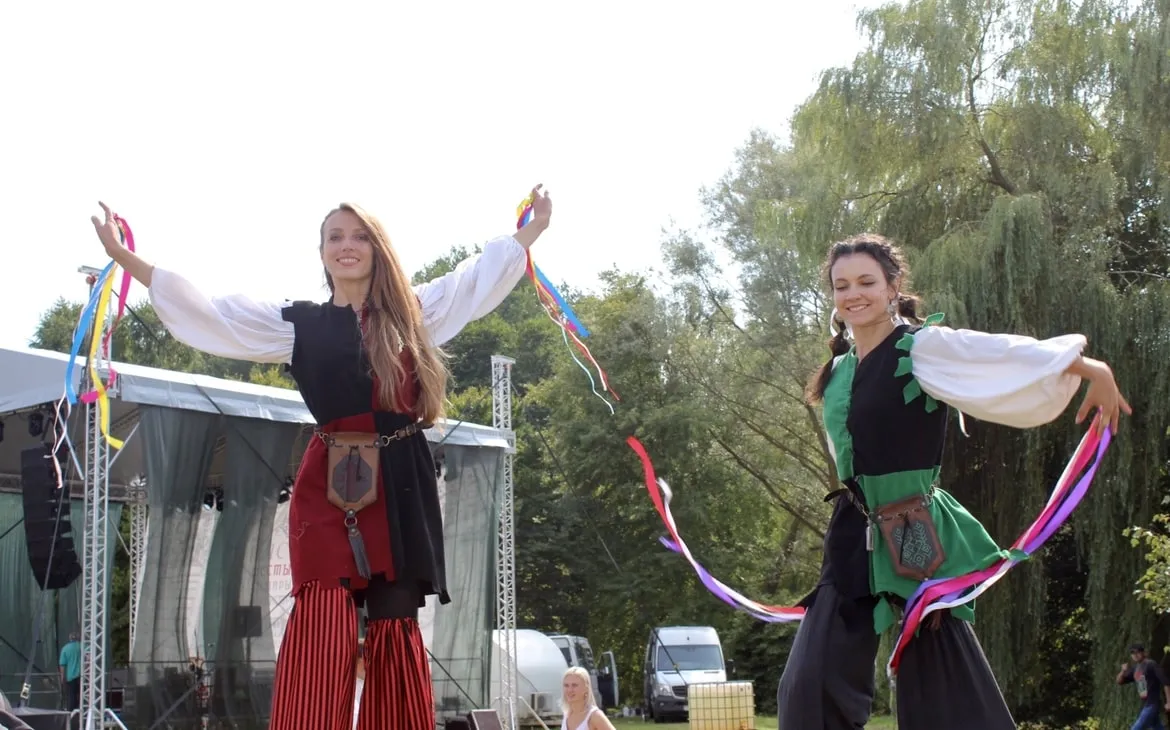 Перед сценой работал фудкорт, где угощали разливным пивом, медовухой, вареной кукурузой и ароматными драниками. Здесь же танцевали, играли музыку и фотографировались с ходулистами – их яркие костюмы переливались на солнце и притягивали внимание зрителей ещё на входе. Время от времени ходулистов сменяли мастера огня, которые виртуозно обращались с огненными фетилями и обручами.