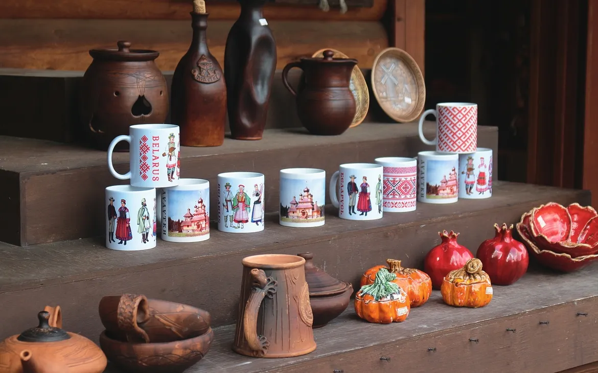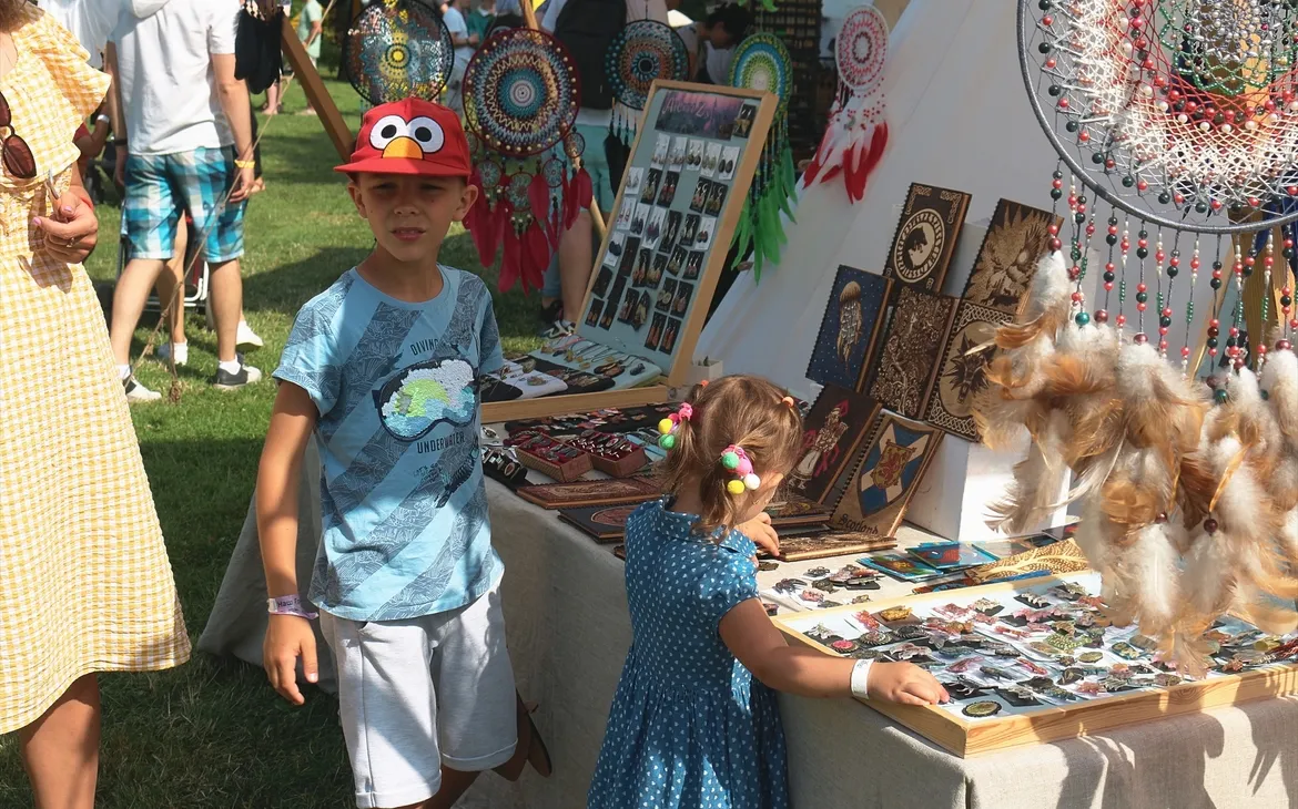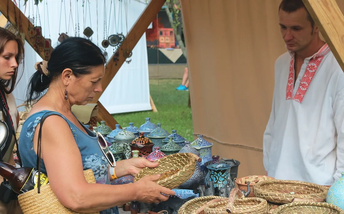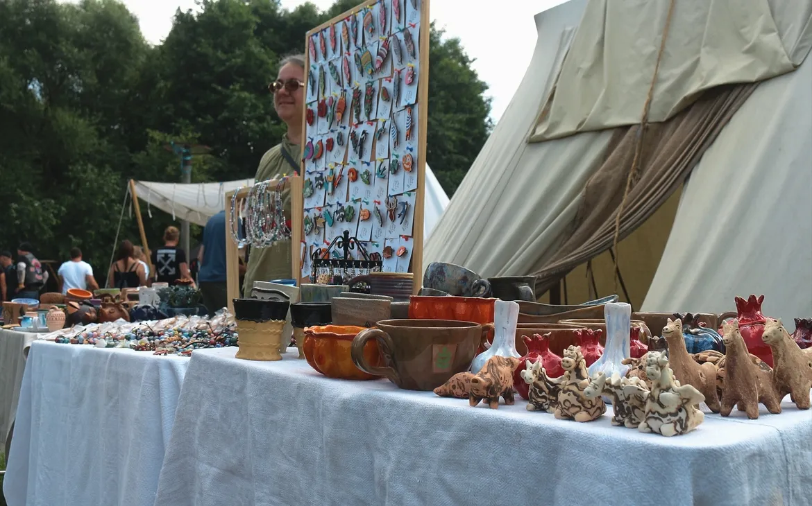 На огромной территории раскинулась ярмарка с сувенирной продукцией и авторскими изделиями народных мастеров: украшения, свистульки, плетённую и глиняную посуду, свечи и многое другое.