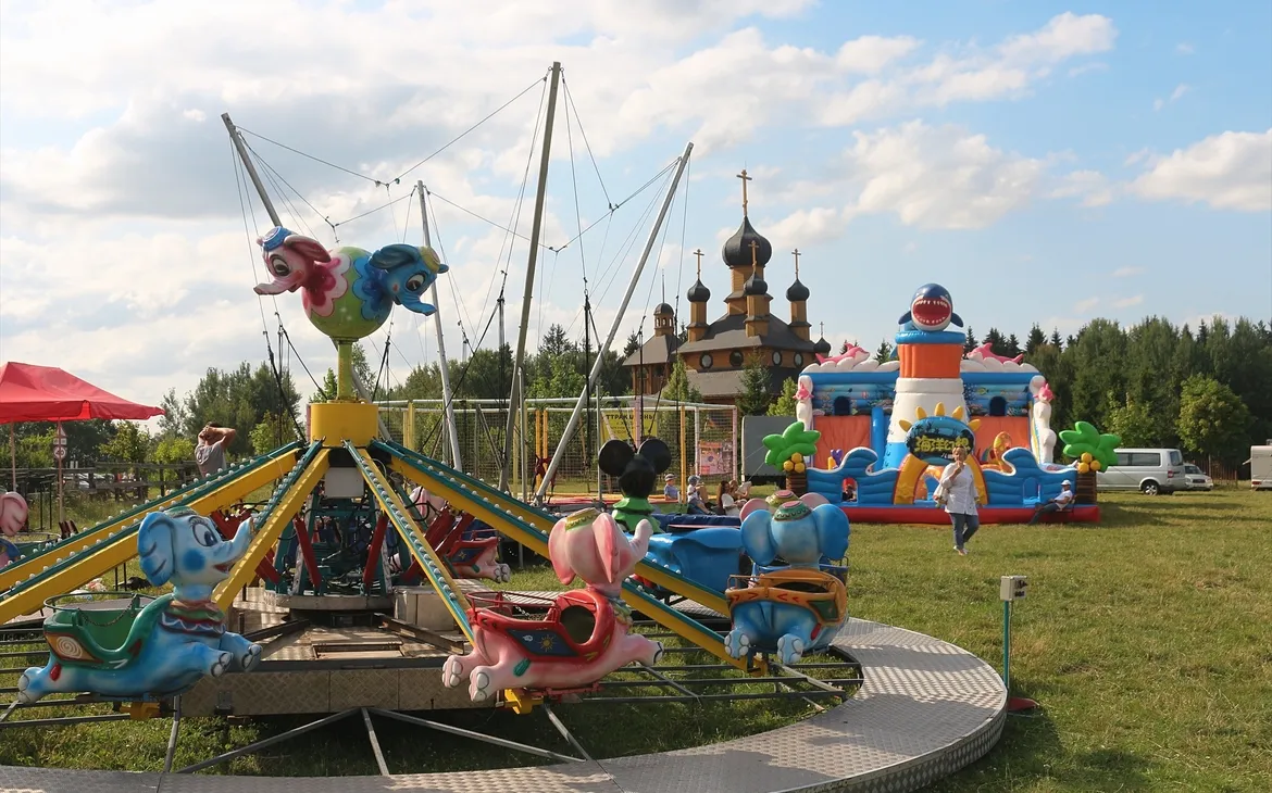 Для маленьких посетителей перед комплексом установили площадку с аттракционами, ларьками с мороженым и сладкой ватой.