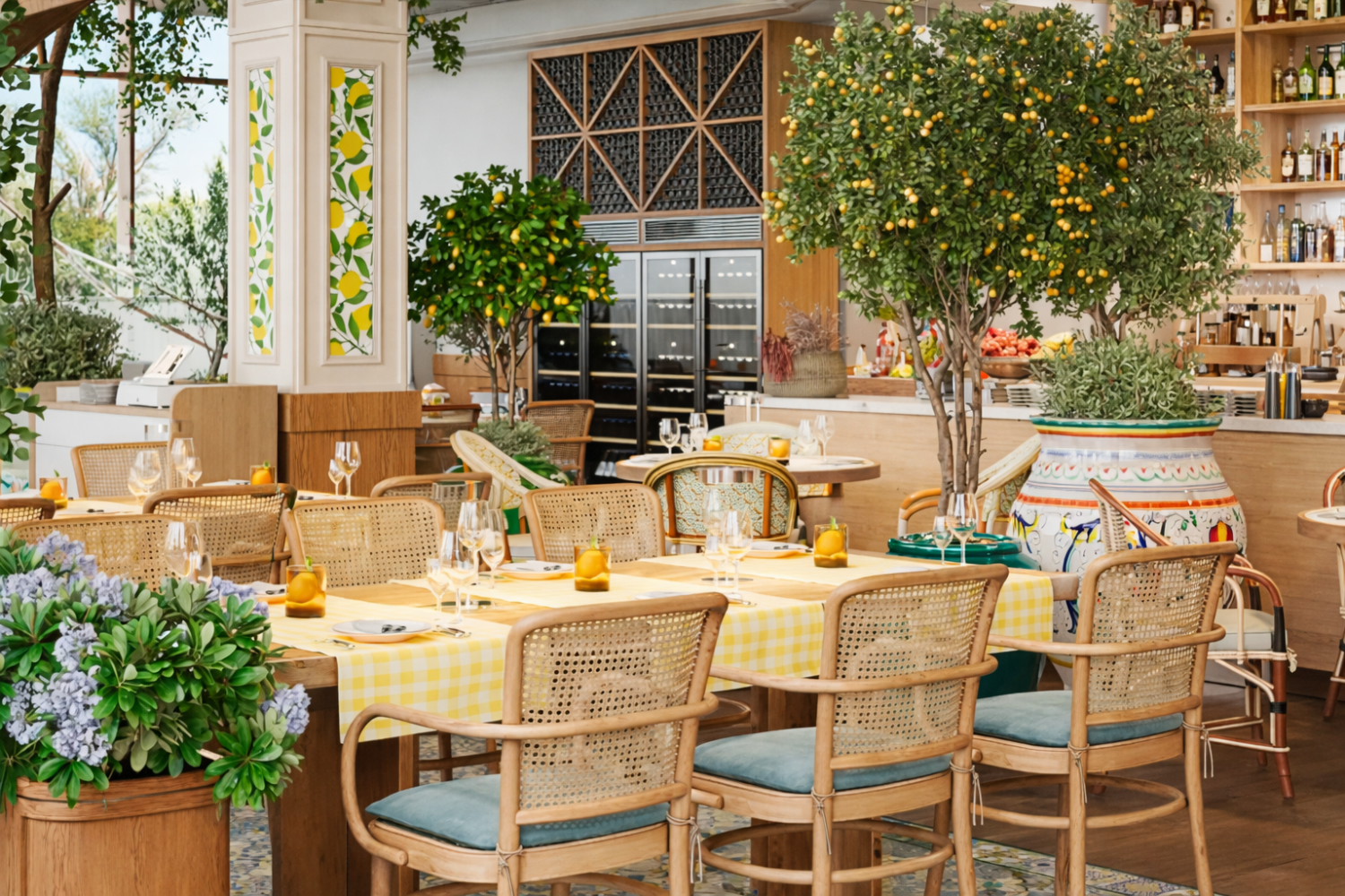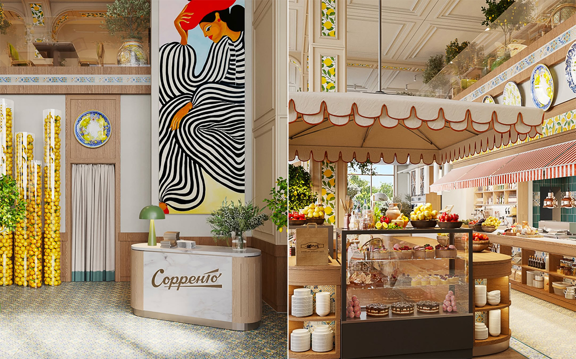Двухуровневое пространство с панорамными окнами, наполненное светом, живые оливковые и лимонные деревья, плетеная мебель и, разумеется, ароматы свежеприготовленных блюд, как с Амальфитанского побережья — это все новый «Сорренто». Ресторан рассчитан на 160 гостей. В распоряжении посетителей просторный основной зал, уютная антресоль и VIP-зал на 16 персон для камерных встреч и частных событий.