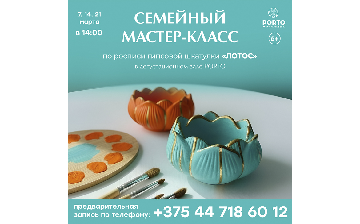 Art-мастерская (7, 14, 21 марта, 14:00) — это тёплый семейный ритуал, где дети и взрослые вместе расписывают гипсовую шкатулку «Лотос». Яркие краски, свобода фантазии и особенная атмосфера уюта превращают мастер-класс в настоящее арт-приключение.