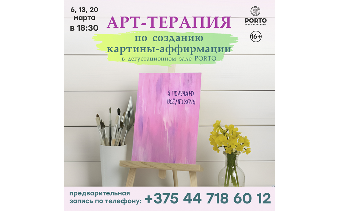 ART & WINE (6, 13, 20 марта, 18:30) — формат для тех, кто хочет переключиться после рабочего дня и провести вечер красиво. Здесь учат не академическому рисунку, а как выражать свои чувства на холсте. Холст, краски, бокал игристого и внутренняя свобода. Каждый гость создаёт картину-аффирмацию с важными словами о любви, мечтах и жизни.