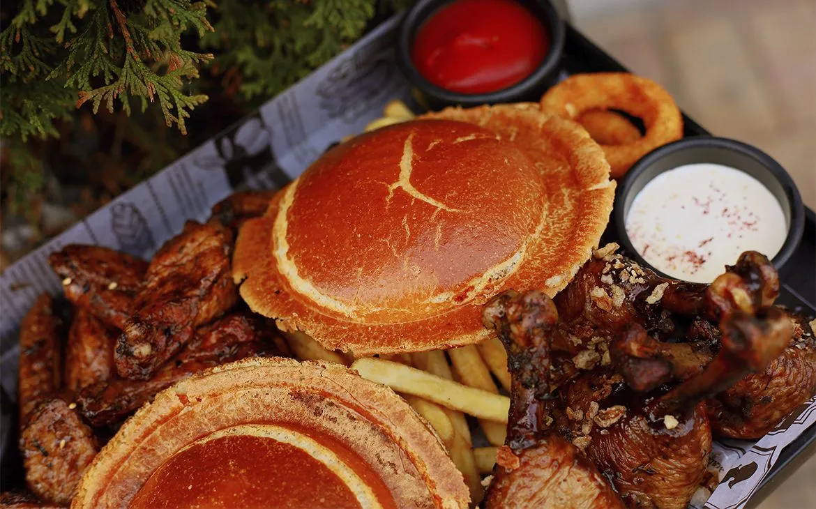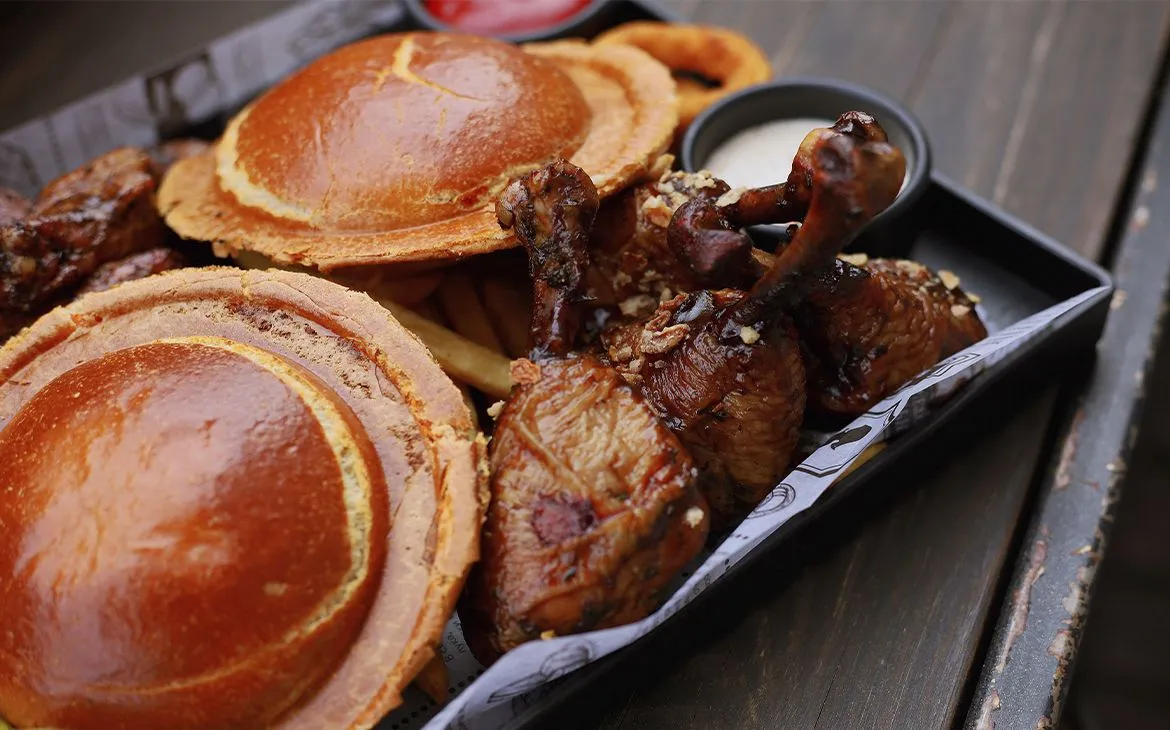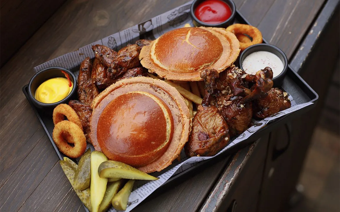 Этот гастросет — настоящий взрыв вкуса для компании друзей. В меню: сочные UFO-бургеры, аппетитные куриные лоллипопы и крылья в соусе BBQ, хрустящий картофель фри, луковые кольца, пикантные консервированные огурцы и три соуса — сырный, алабама и кетчуп. Вес сета — внушительные 1380 г, а цена — всего 52 BYN!