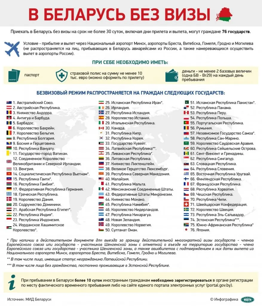 В Беларуси изменился порядок безвизового въезда в республику. Приехать в страну на срок не более 30 суток, включая дни прилёта и вылета, могут граждане 76 государств.