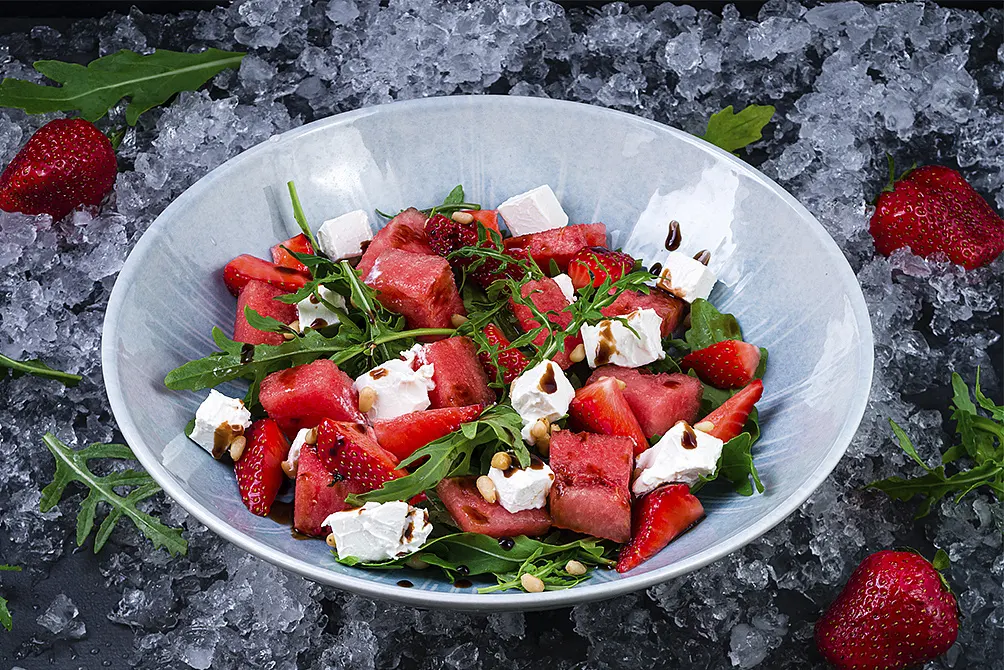 Салат с арбузом, сыром фета и клубникой – изящная игра на контрастах вкусов и текстур.