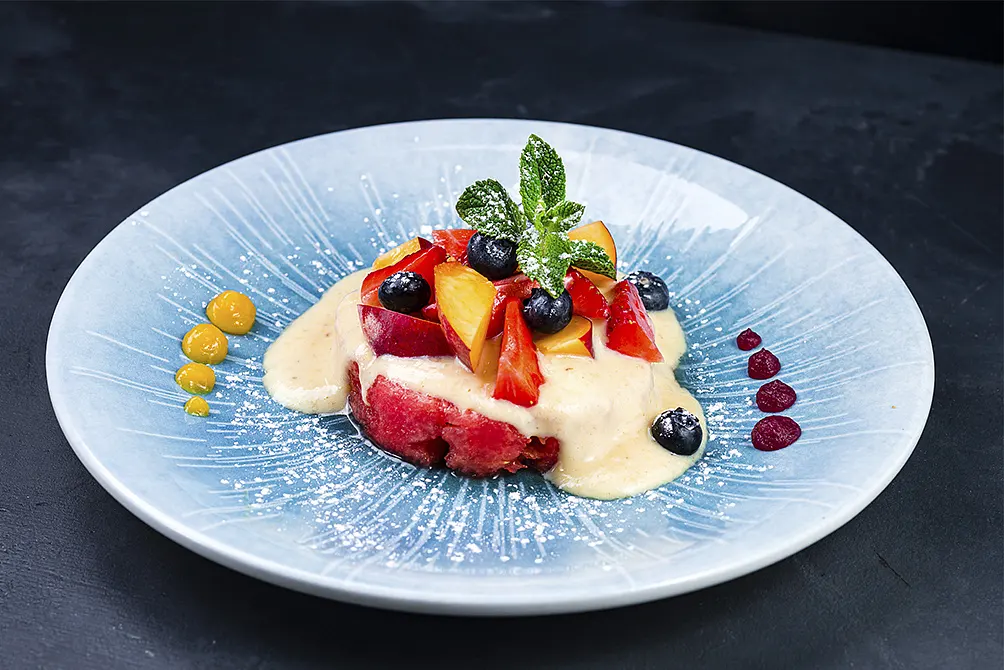 Арбуз с цитрусовым кремом и ягодами – нежное сочетание для летнего настроения.