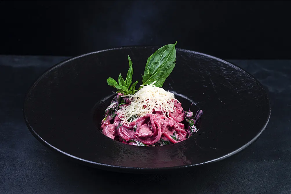 Паста с курицей и шпинатом в сливочно-свекольном соусе – цвет и вкус, создающие солнечную погоду, независимо от прогнозов синоптиков.