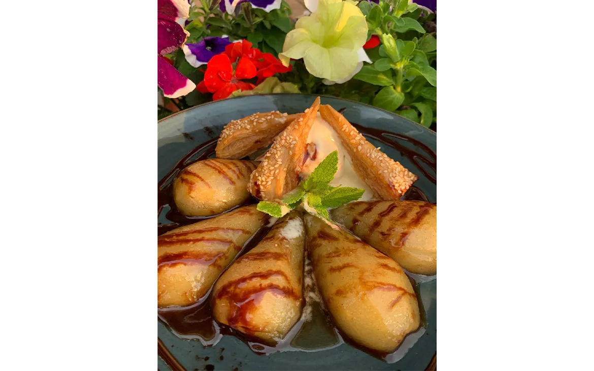 Секрет Марысеньки – десерт, на создание которого команду «Кухмистра» вдохновила история любви Марии Казимиры Луиза де Ла Гранж д’Аркьен, известной как просто «Марысенька» и ее мужа польского короля и великого князя литовского Яна Собесского, знаменитого победой над турками под Веной в 1683 г. Марысенька завезла к нам моду на апельсины. В переписке с королем «Ясем» она часто писала о сладких les oranges, намекая на их романтические отношения. Итак, на десерт –печеная груша в апельсиновом ликере и палочками из слоеного теста.