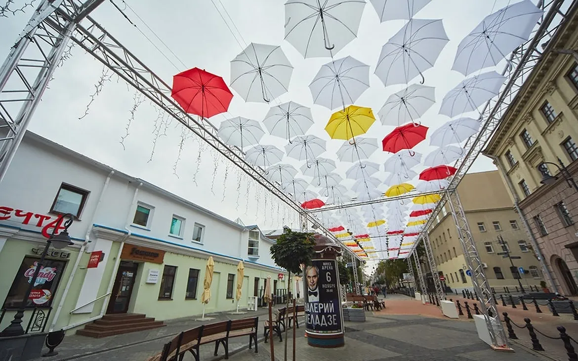 Раньше белорусы привозили фотографии с множеством парящих зонтиков из европейских городов – подобные конструкции уже стали привычными для Лиссабона, Барселоны, Киева, Санкт-Петербурга и других. Теперь же красочную инсталляцию можно найти в центре Минска на пешеходной улице Комсомольской. Но «Комфортная аллея» с парящими зонтиками не останется на этой улице навсегда, а лишь на пару недель.