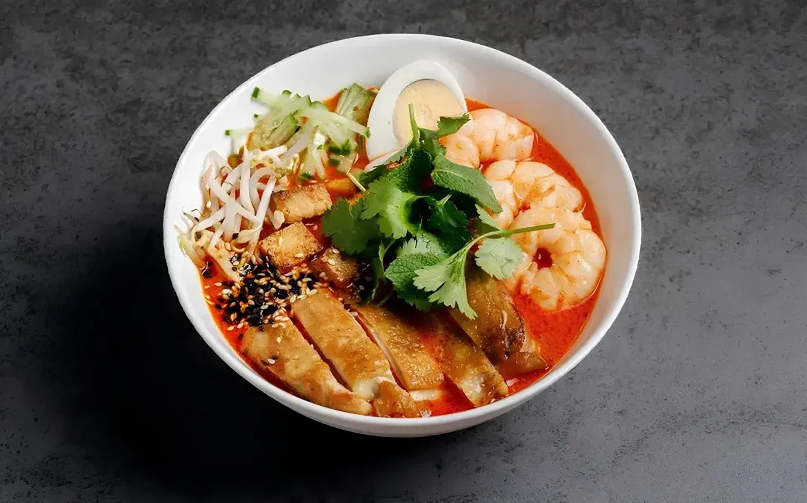 Суп Лакса – индонезийская еда на основе карри с рисовой лапшой, креветкой, курицей, яйцом, тофу, ростками маша, огурцом, кинзой и мятой. Необычное сочетание пряного и свежего вкусов.
