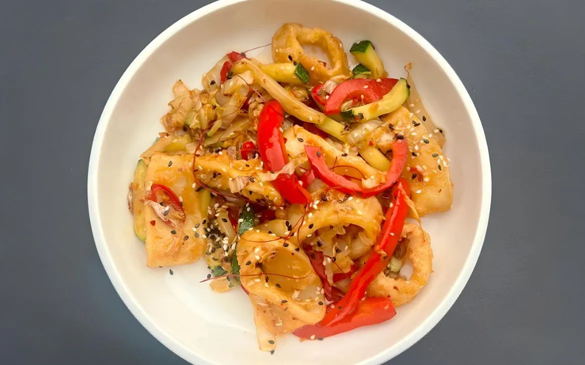 Стрит-фрай с кальмаром – яркое пикантное блюдо, которое добавит красок в любой день (острый кальмар в панировке с цукини, сладким перцем, пекинской капустой, чили и лаймом).
