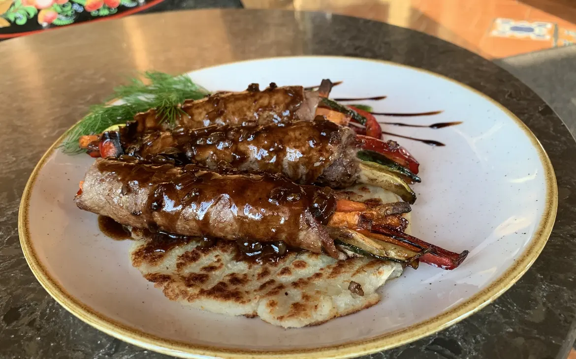 В меню представлен большой выбор блюд из мяса, птицы и рыбы, горячих и холодных закусок, супов, десертов, свежей выпечки. Здесь вы также можете попробовать напитки собственного производства: медовый квас и клюквенный морс.
