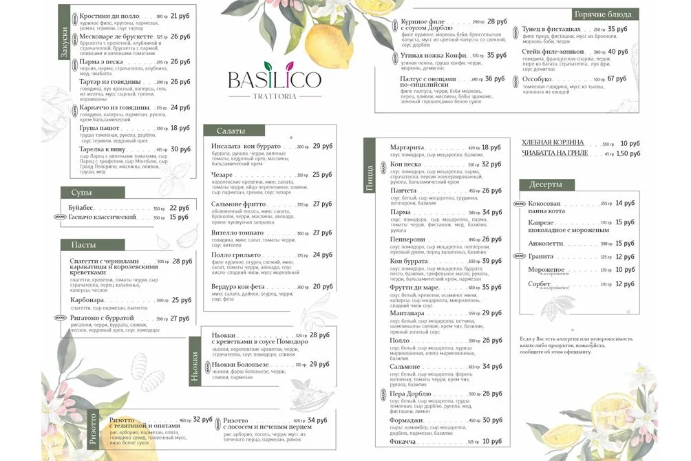 В новом меню вас ждут классические итальянские и европейские закуски, традиционные для формата траттории позиции – пиццы, паста, ризотто, а также другие простые и понятные блюда с акцентом на красивую подачу.