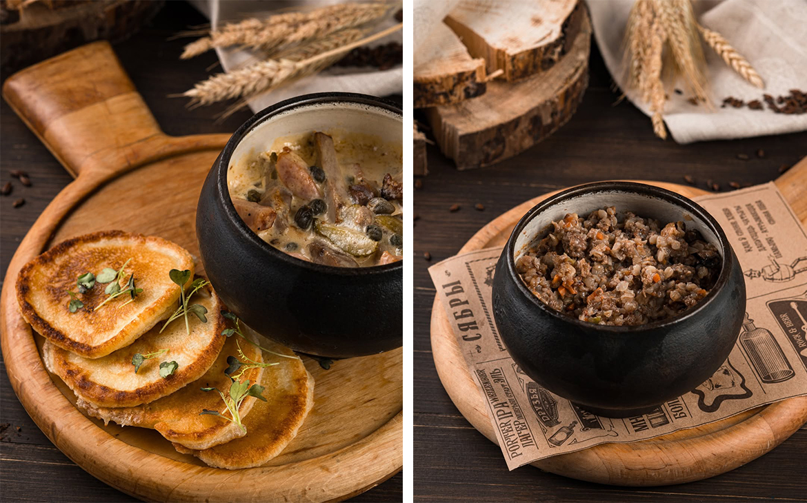 Для любителей основательных блюд — бефстроганов из говядины с картофельным пюре и салатом из маринованных груздей, горшочек с драниками, копчёной курочкой и грибами, а также княжеская мачанка с пышными блинчиками, созданная для неспешных и тёплых встреч.