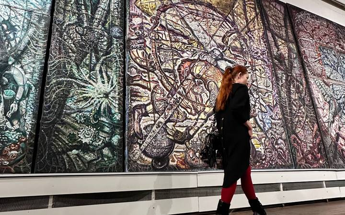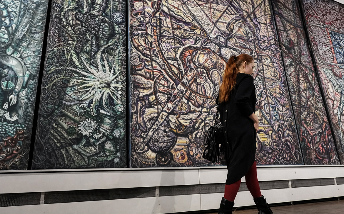 Его космические полотна состоят из мириад линий, точек и микроскопических форм, создающих эффект движения и бесконечного погружения.