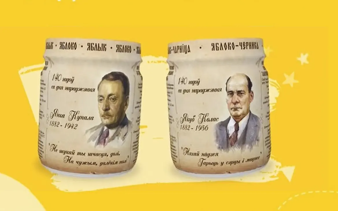 Кампанія «Ложка в ладошке» выпусціла лімітаваную лінейку дзіцячага пюрэ з партрэтамі класікаў беларускай літаратуры, Янкі Купалы і Якуба Коласа.