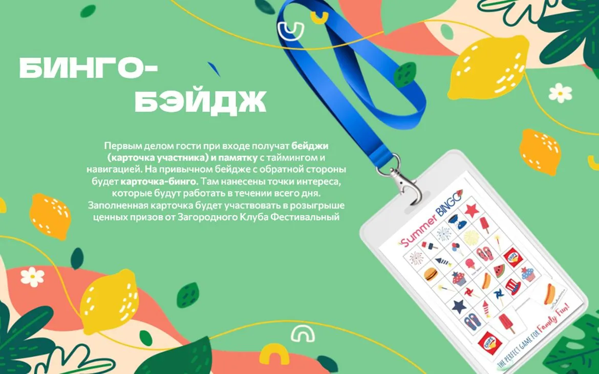 На старте каждый получит свой бинго-бейдж: проходите испытание в интерактивных локациях и получайте отметки, чтобы участвовать в розыгрыше ценных призов от «Фестивального».