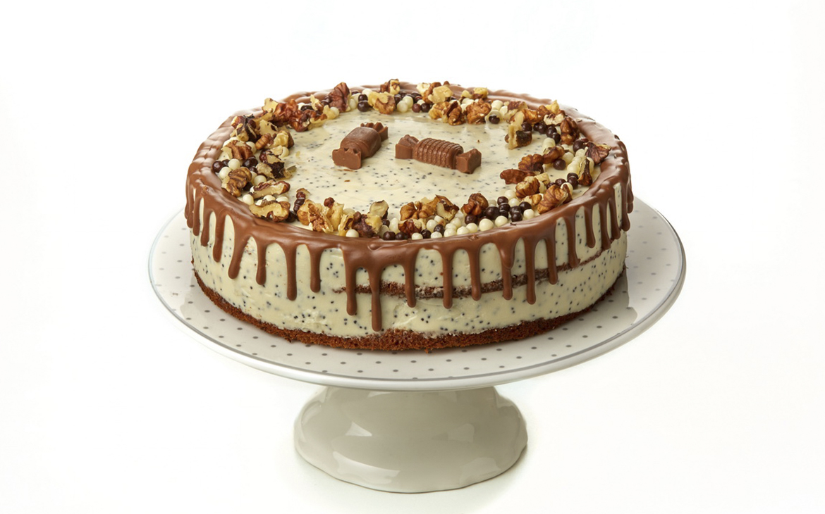 Аппетитные коржи «Мелла», чередующиеся с кремовыми слоями кремчиза, белого шоколада и мака. Между ними —щедрый слой тягучей карамели, а поверхность украшает молочный шоколад, карамель, грецкий орех и шоколадные дропсы.