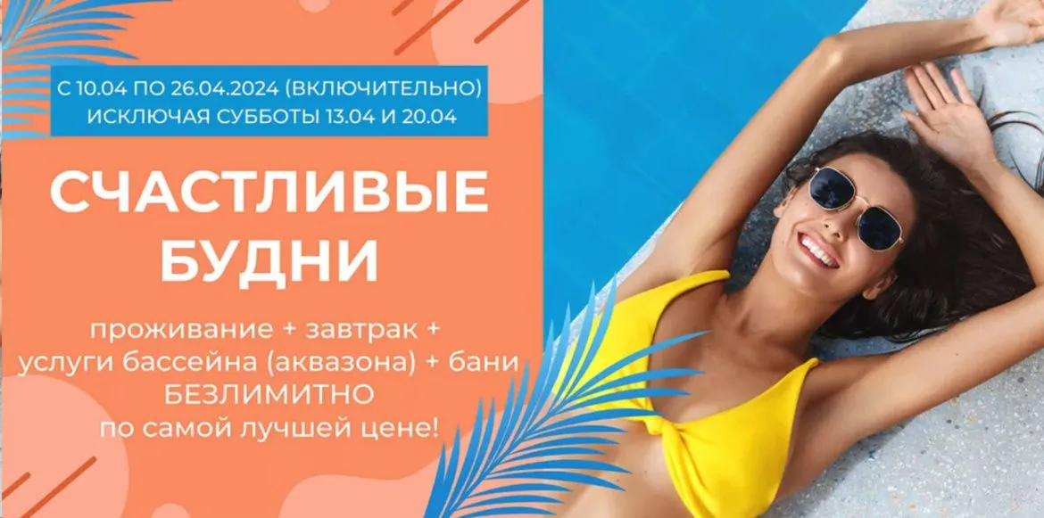 В отеле «Аква-Минск» с 10.04 по 26.04.24 (включительно), исключая субботы 13.04 и 20.04.24, действует специальное предложение для гостей – «Счастливые будни».