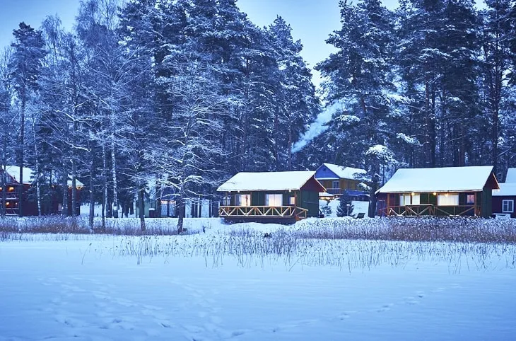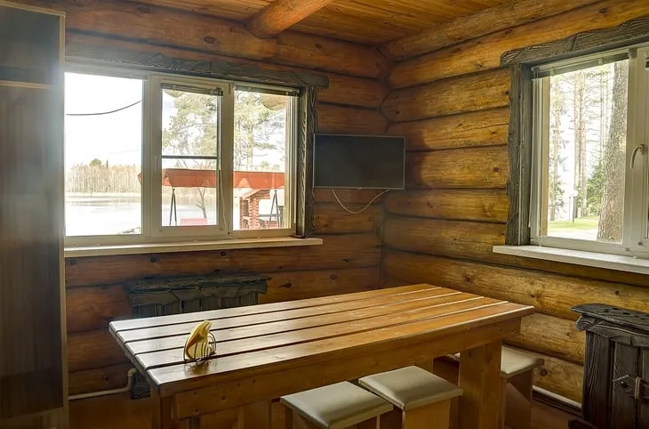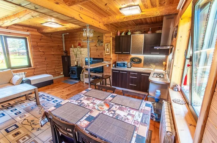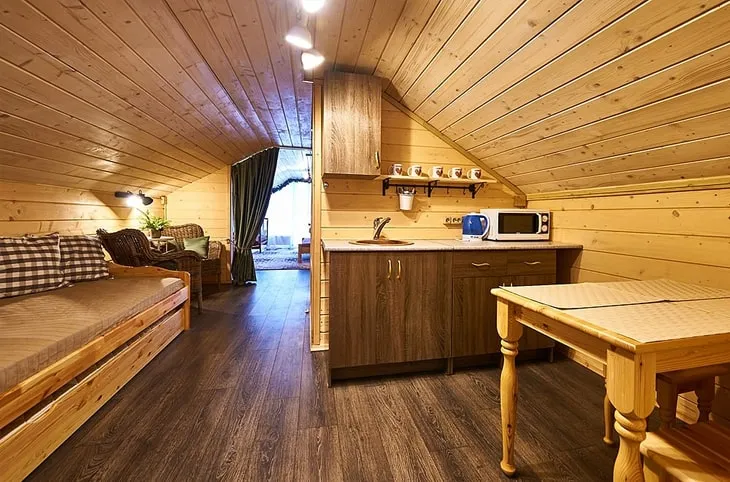 Для проживания – семь хорошо оборудованных домов, в том числе «Рыбацкий» (270 руб./сутки) и «Охотничий» (400 руб./сутки). При каждом из них есть террасы с мангалом. Среди них расположились две русские бани, где можно хорошенько попариться вениками, а у воды есть ещё баня по-чёрному. А в феврале действует акция «Влюблённый февраль»: для пары (или пара плюс ребёнок) аренда «Грибного», «Деревенского» или «Рыбацкого дома» составит 140 руб. в сутки!