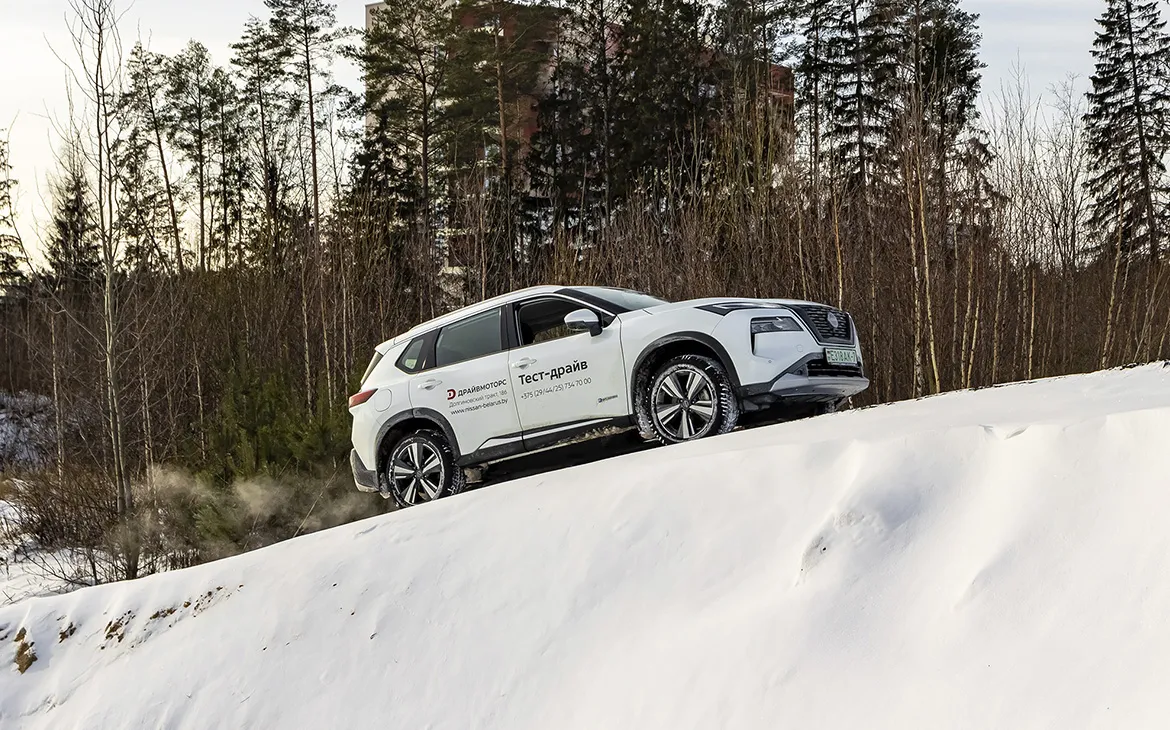 Забегая вперед: X-Trail справился со всеми препятствиями. Горка с уклоном 30 градусов, такой же спуск — автомобиль уверенно поднимался и спускался снова и снова. Рыхлый глубокий снег тоже не оказался проблемой — машина ни разу не забуксовала, мягко и спокойно двигалась вперед, проглатывая при этом неровности и замерзшие борозды под снегом. Идеальное сцепление шин с поверхностью помогло преодолеть и скользкие участки дороги: лед заставил сбавить скорость, но машина шла ровно, без заносов и пробуксовок.