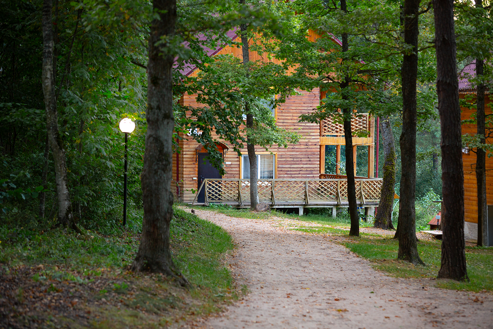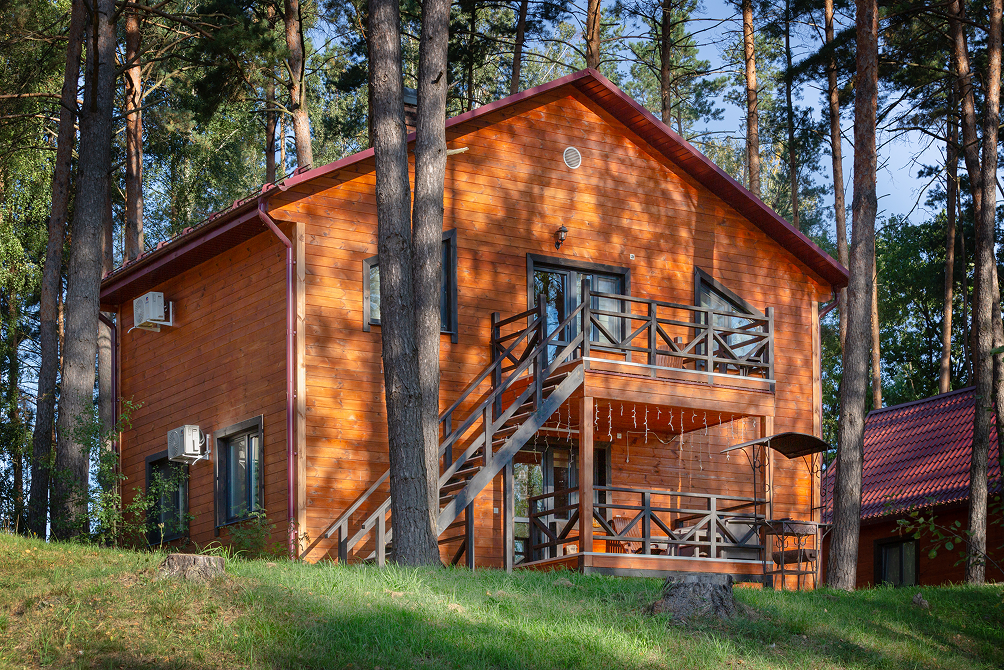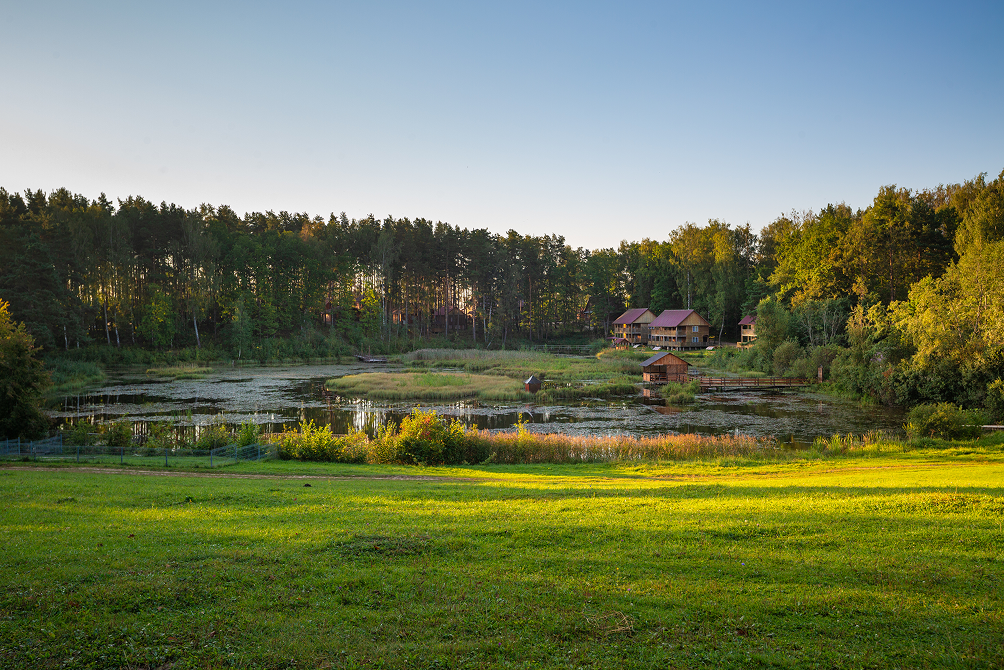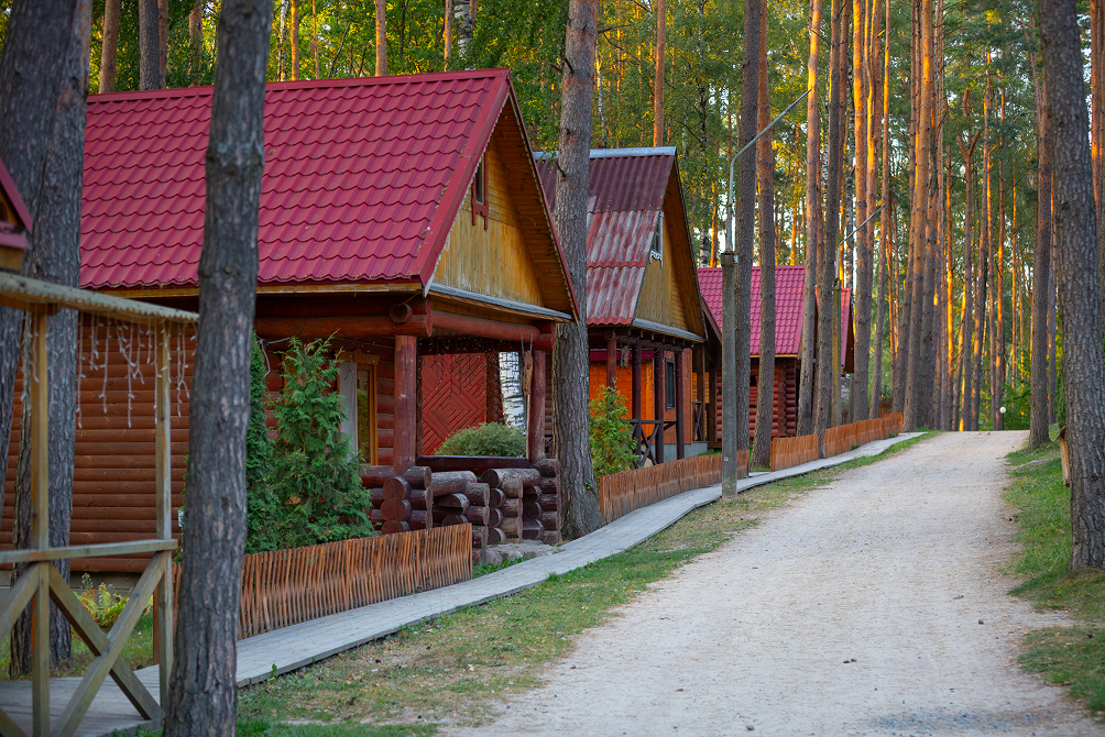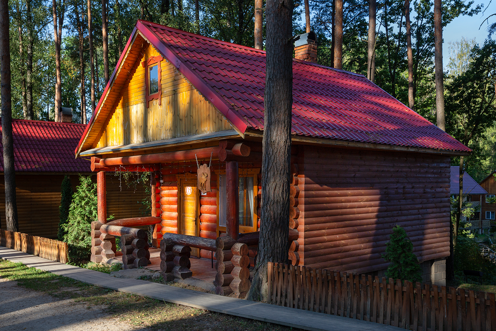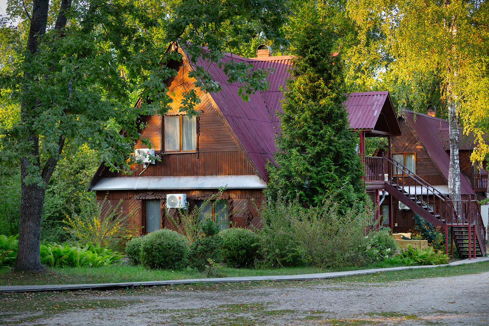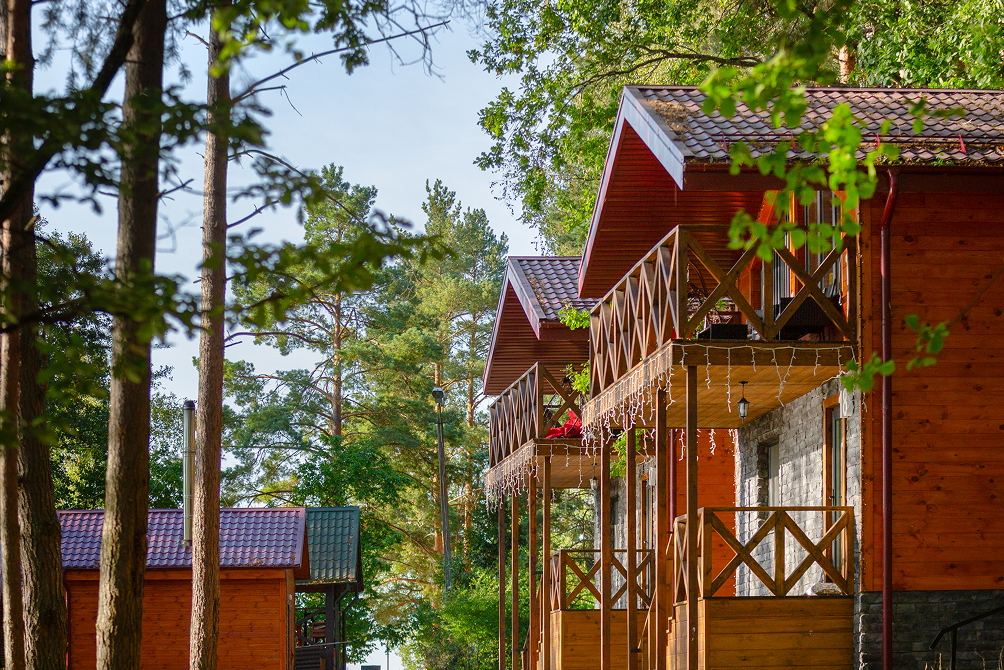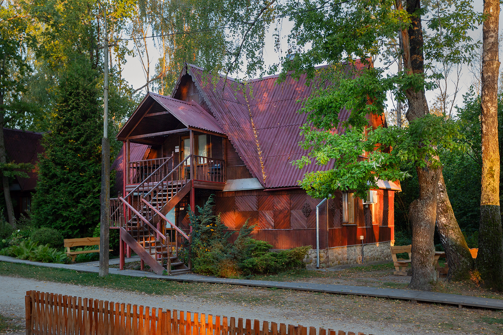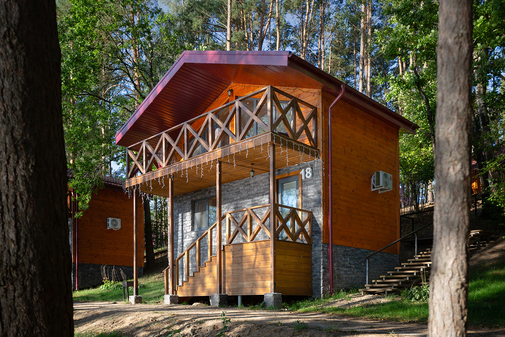 Все домики построены из натурального дерева и сочетают экологичность с комфортом. Гости могут выбрать компактный номер для двоих, просторные коттеджи для семьи или варианты с террасами, каминами и панорамными окнами. В кафе пансионата подают блюда белорусской и европейской кухни из свежих продуктов с подворья.