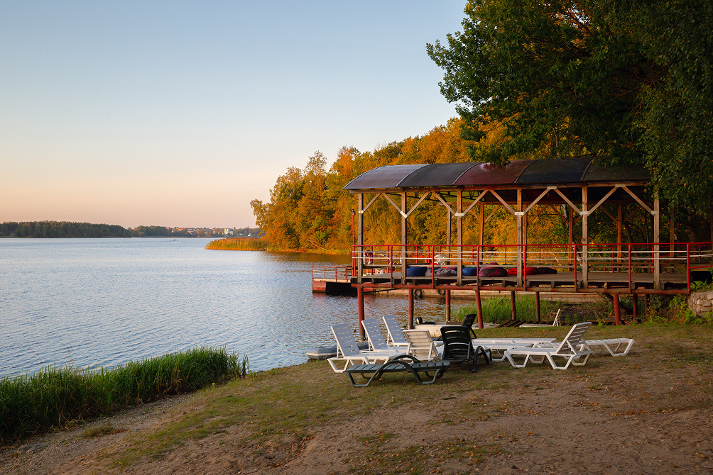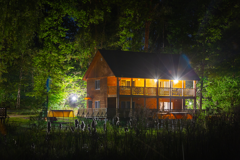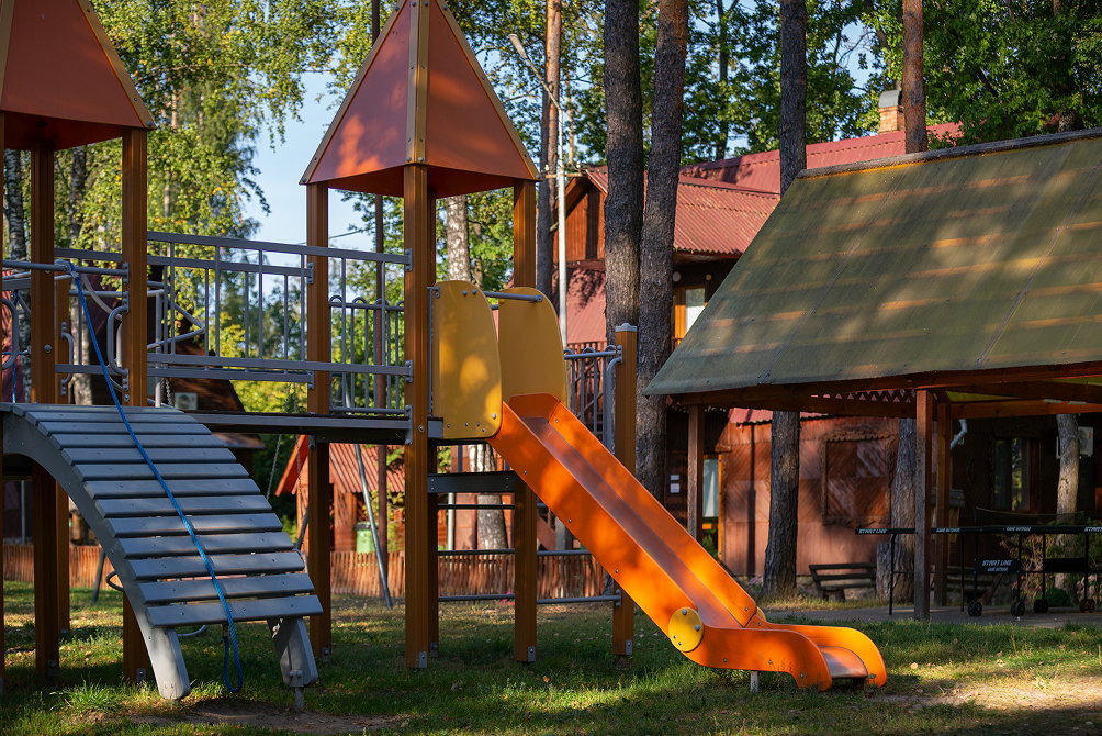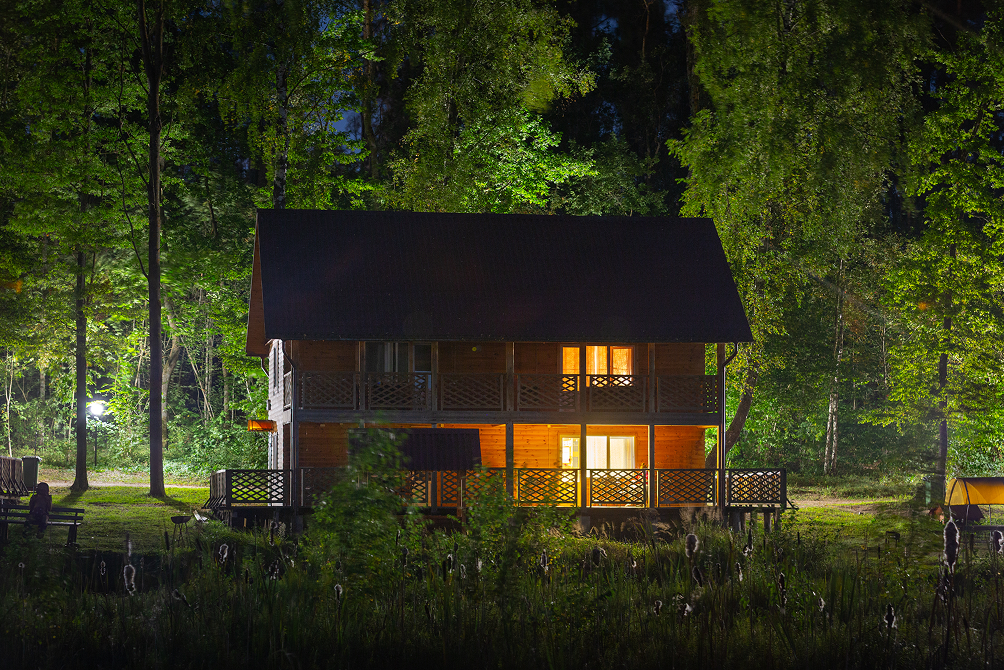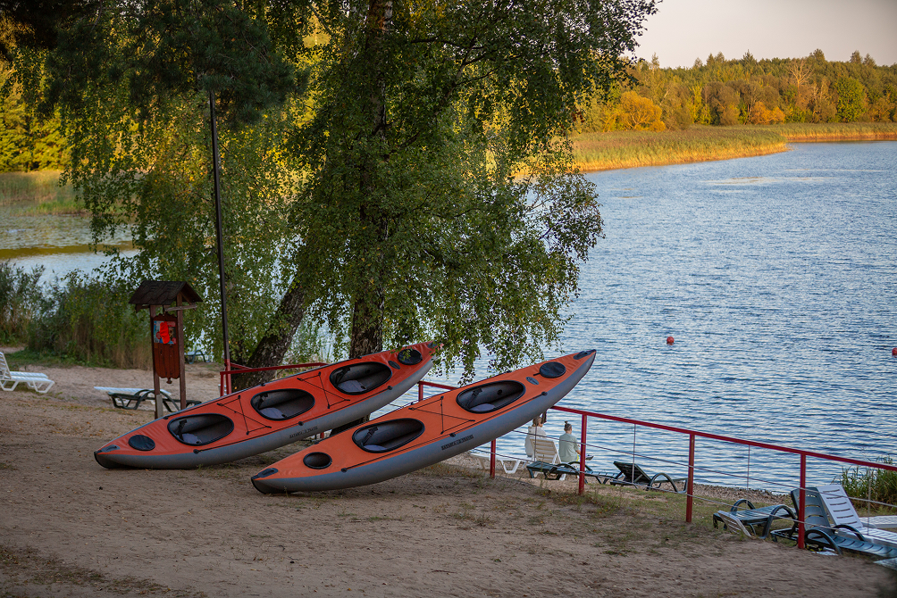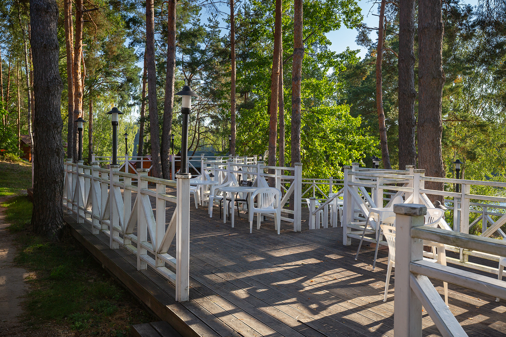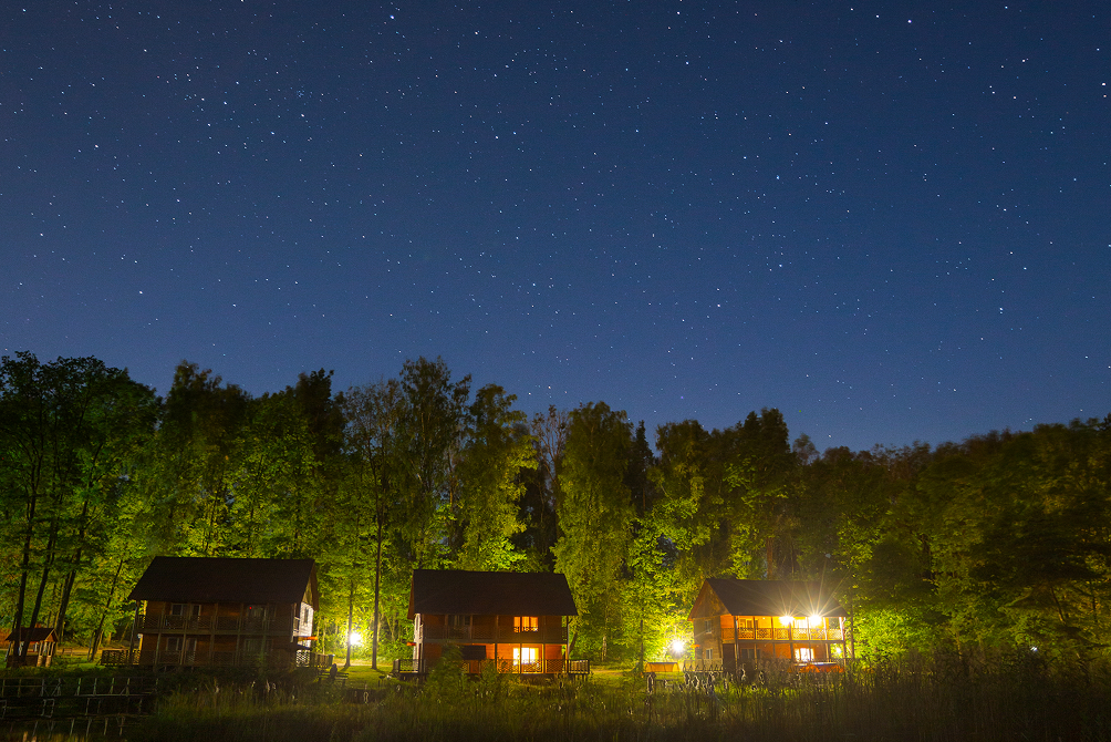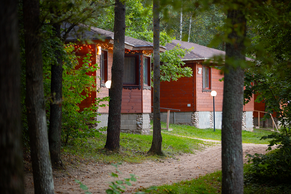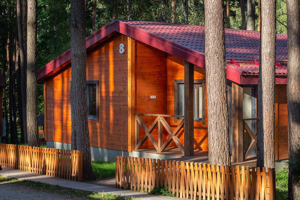 Все домики построены из натурального дерева и сочетают экологичность с комфортом. Гости могут выбрать компактный номер для двоих, просторные коттеджи для семьи или варианты с террасами, каминами и панорамными окнами. В кафе пансионата подают блюда белорусской и европейской кухни из свежих продуктов с подворья.