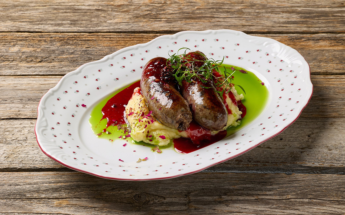 Томлёные колбаски из оленины с коньяком, пюре и соусом из лесных ягод - яркое завершение гастрономического путешествия.