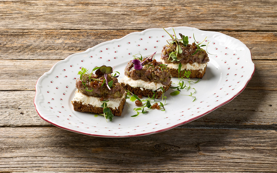 Тартар из оленины с домашним сыром, икрой из перца и еловым маслом — вкус, рожденный природой.