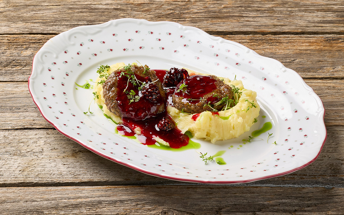 Котлеты из оленины с вяленой брусникой, картофельным пюре и еловым маслом — классика в новом звучании.