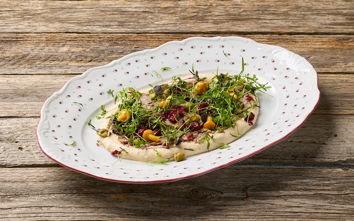 Оленина тоннато с вяленой клюквой и каперсами — нежность, в которой встречаются лес и Средиземноморье.