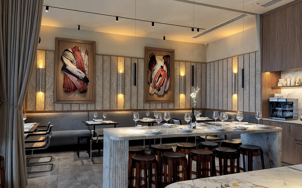 Пространство спроектировано как современный гастро-объект, где каждая деталь работает на комфорт: продуманный свет, спокойная музыка и лаконичный интерьер создают атмосферу без перегруженности.