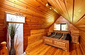 Для размещения гостям предлагают два деревянных дома: с баней на 6 человек и гостевой, в котором комфортно могут проживать 2-3 человека. Большой дом оснащён просторной парилкой с душем и комнатой отдыха, рядом – небольшой бассейн глубиной 1,6 м, крытая беседка с русской печью. Интерьер гостевого дома выполнен в духе национальной традиции. Здесь есть спальня с большой кроватью, гостиная-студия и кухня. Перед домом под навесом оборудована чилаут-зона с лавочками и столиком.